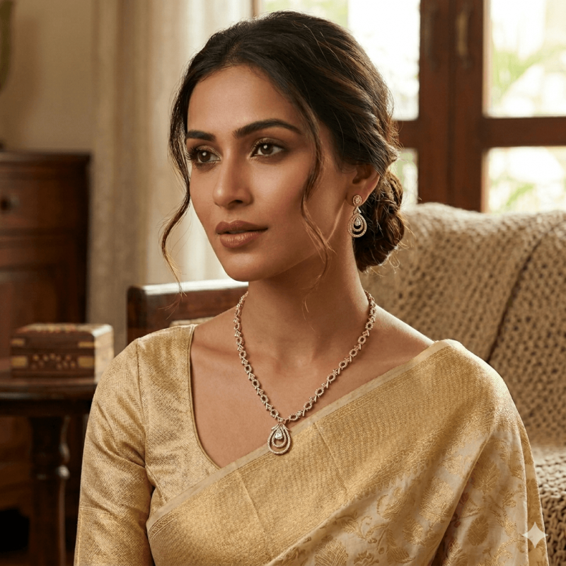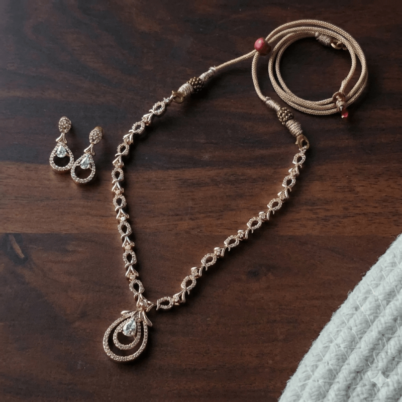 Make a statement with this elegant pendant necklace set, beautifully crafted with a delicate stone-studded chain and a stunning layered teardrop pendant. Paired with matching earrings, this set exudes timeless charm and sophistication.