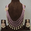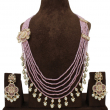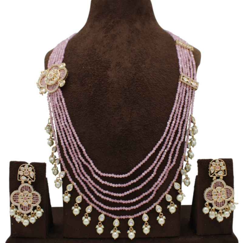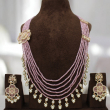 | The image features an elegant jewelry set displayed on a brown velvet bust. The centerpiece is a multi-layered necklace composed of delicate pink beads, adorned with intricate gold and pearl accents. The necklace cascades down in a layered fashion, creating a stunning visual effect. Accompanying the necklace are matching earrings, which also feature the same gold and pearl detailing, enhancing the overall aesthetic of the set. The display is designed to showcase the intricate craftsmanship and beauty of the jewelry. |
