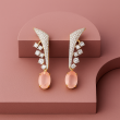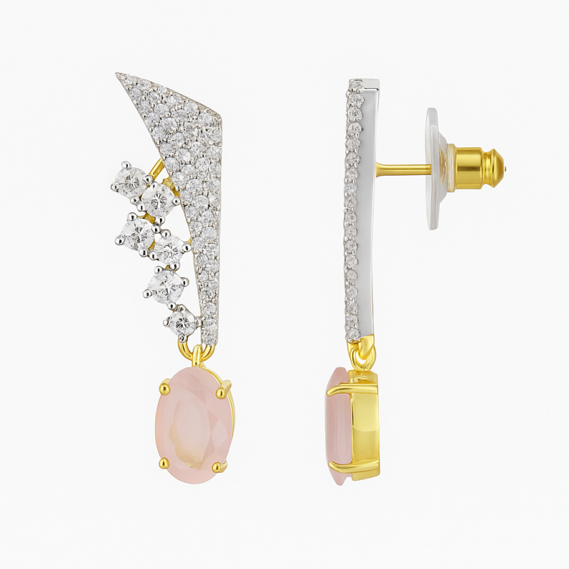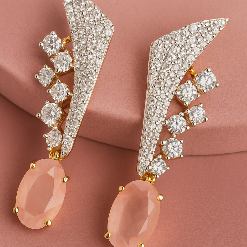 These modern designer earrings are crafted with precision, featuring a stunning combination of sparkling American Diamonds and a soft pink oval stone drop. The sharp geometric top design, embedded with fine CZ stones, beautifully contrasts with the delicate pastel pink gemstone, giving these earrings a perfect balance of glamour and elegance. Lightweight yet bold, they are ideal for parties, festive events, or a sophisticated evening look. The golden base enhances the brilliance of the stones, making them a versatile addition to your jewelry collection.