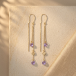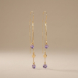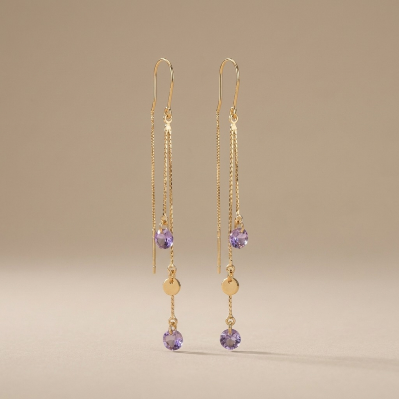 Elevate your jewelry game with these ethereal threader earrings. Featuring delicate gold chains that cascade elegantly, these earrings are punctuated by brilliant, faceted amethyst-purple stones and polished gold discs. Designed to catch the light with every movement, they offer a sophisticated "linear luxury" that feels both modern and timeless.