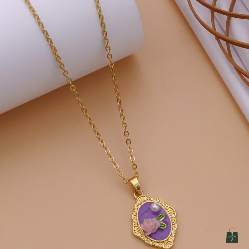 Add a touch of romantic charm to your jewelry collection with this elegant floral enamel pendant necklace. Designed with a rich purple enamel background, the pendant features a delicate rose motif accented with soft pink tones and tiny green leaves, creating a graceful and feminine aesthetic.