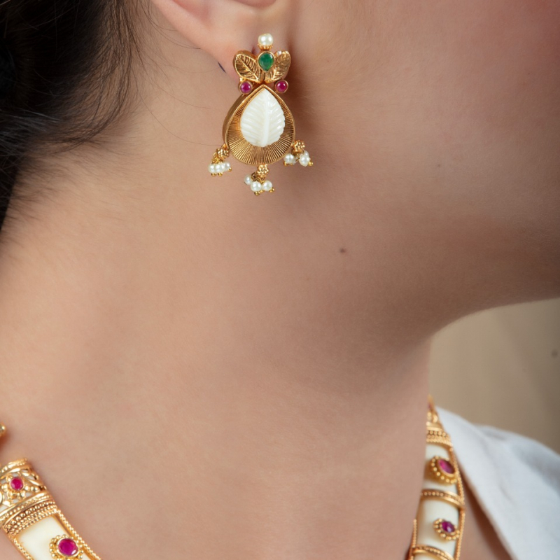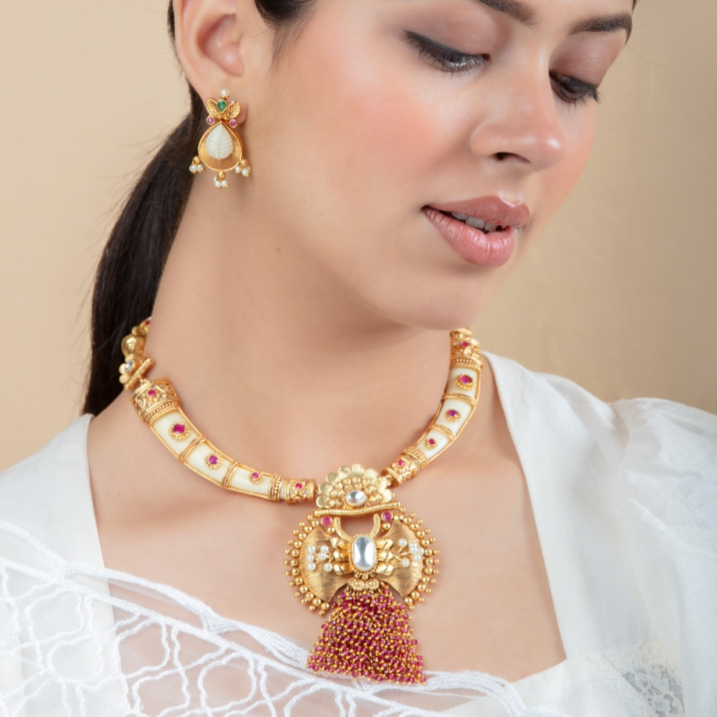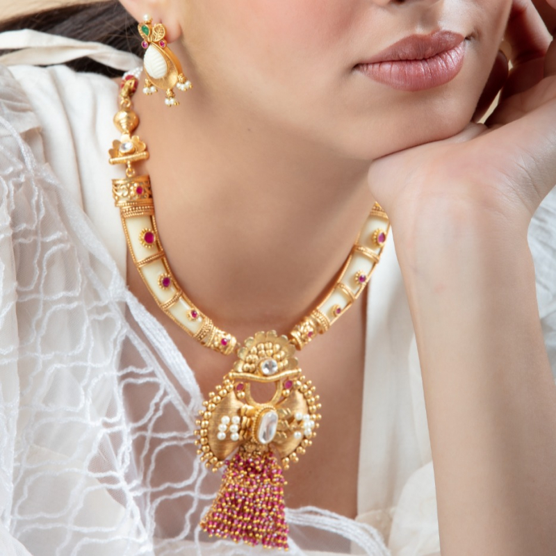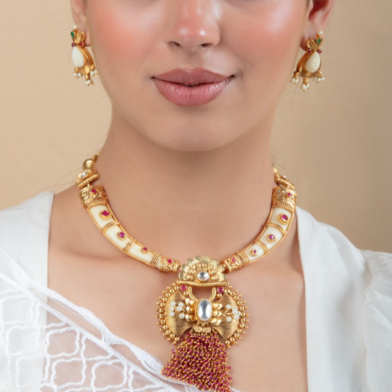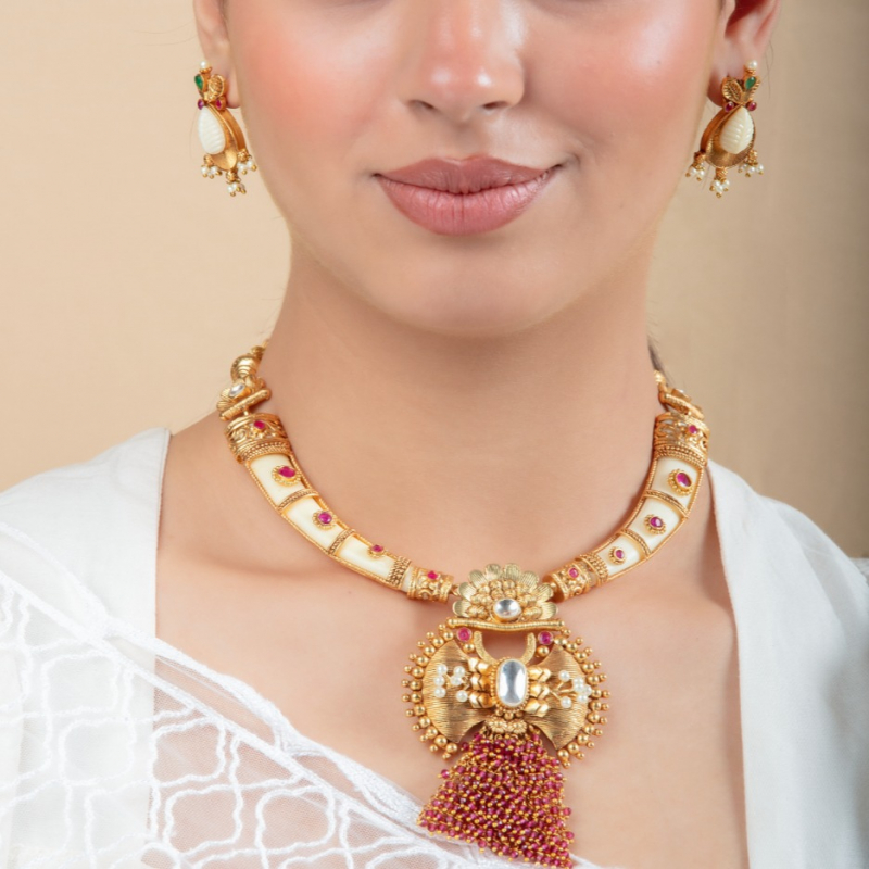 The pendant is enhanced with a pearl centerpiece and finished with intricate bead tassels in rich pink tones, giving it a modern yet traditional appeal. Paired with matching earrings, this set is perfect for festive occasions, intimate weddings, and party wear. Its lightweight and graceful design make it comfortable while still making a statement.