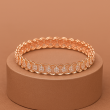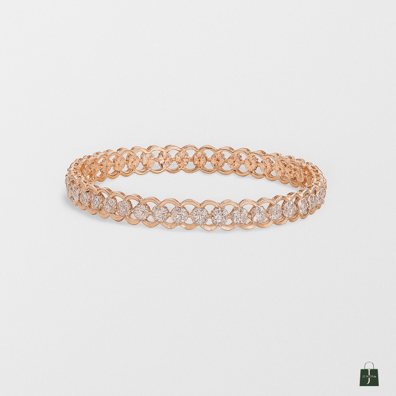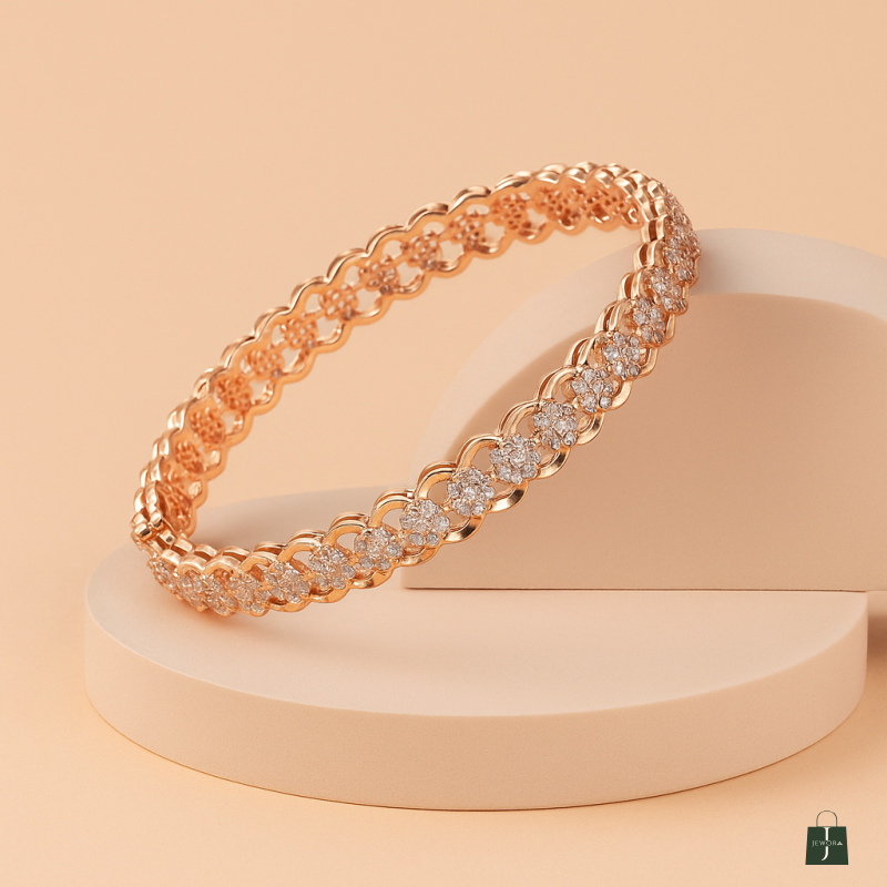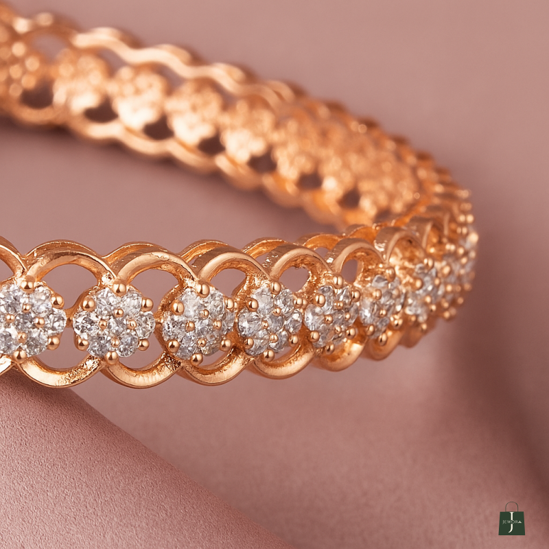 Add a touch of timeless elegance to your jewelry collection with the Elegant Rose Gold Solitaire Bangles. Crafted with precision, this stunning pair features a refined rose gold polish that enhances the brilliance of sparkling solitaire stones, arranged in an alternating oval lattice design. The intricate craftsmanship showcases a modern yet traditional appeal, making these bangles a versatile accessory for any wardrobe. Designed for women who appreciate sophistication, the bangles are lightweight and comfortable, ensuring they can be worn throughout the day without compromise. Perfect for festive occasions, weddings, or even evening parties, they pair seamlessly with both traditional attire such as sarees and lehengas, as well as contemporary outfits like gowns and cocktail dresses. Each bangle is carefully finished to deliver a flawless shine and exceptional durability, ensuring it remains a cherished piece in your collection. Elevate your look with these radiant bangles and let them be the statement accessory that completes your ensemble.