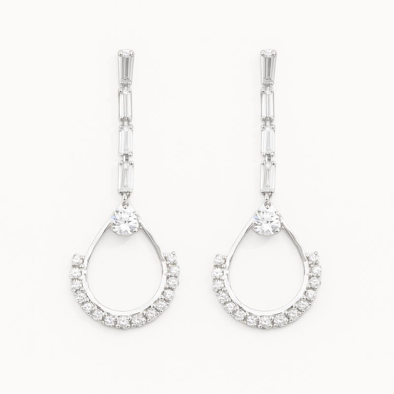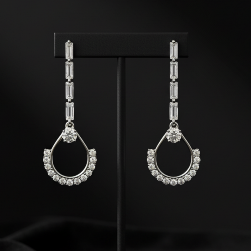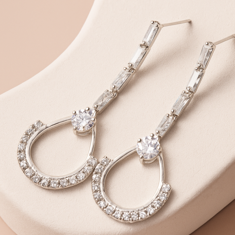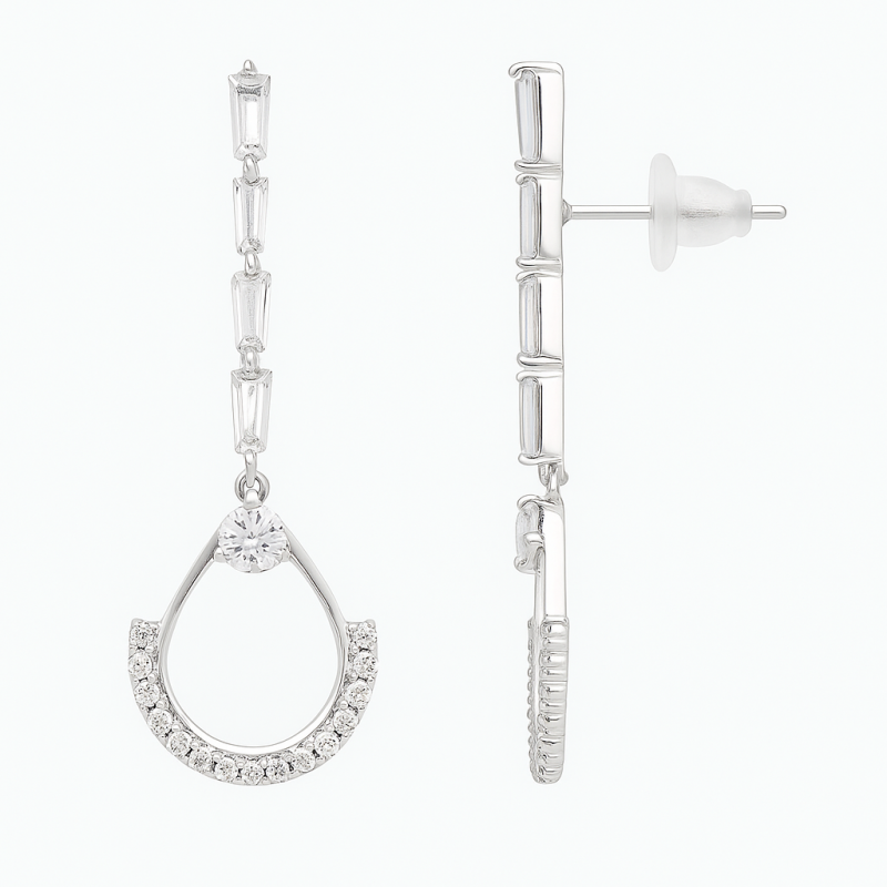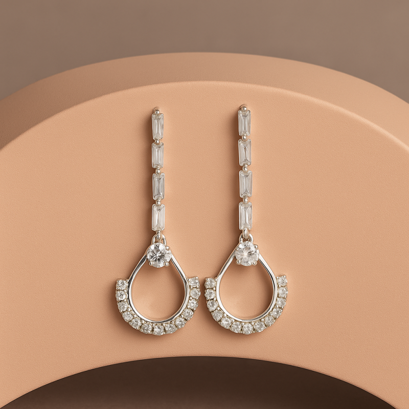 Add timeless sparkle to your collection with these Elegant Silver American Diamond Earrings. Crafted in a graceful teardrop design, each earring is adorned with high-quality American Diamonds (CZ) that shimmer brilliantly under any light. The sleek silver polish enhances the modern aesthetic while the delicate stone arrangement adds just the right amount of glamour. Perfect for party wear, festive occasions, or even pairing with elegant evening attire, these earrings are designed to make you stand out effortlessly. Lightweight yet striking, they promise all-day comfort along with undeniable style. A versatile piece that complements both contemporary and traditional outfits, making it a must-have for every jewelry box.