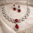 The necklace features a beautifully crafted silver-tone base adorned with shimmering zircon detailing and a bold ruby-look teardrop pendant that creates a graceful statement. The matching earrings perfectly complement the necklace, making it ideal for weddings, festive occasions, parties, and special celebrations.