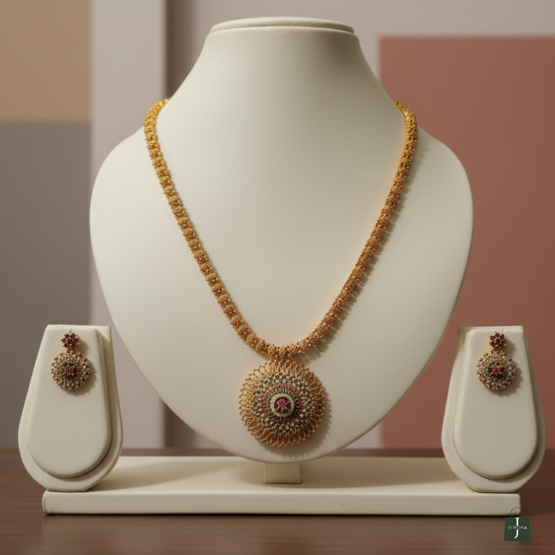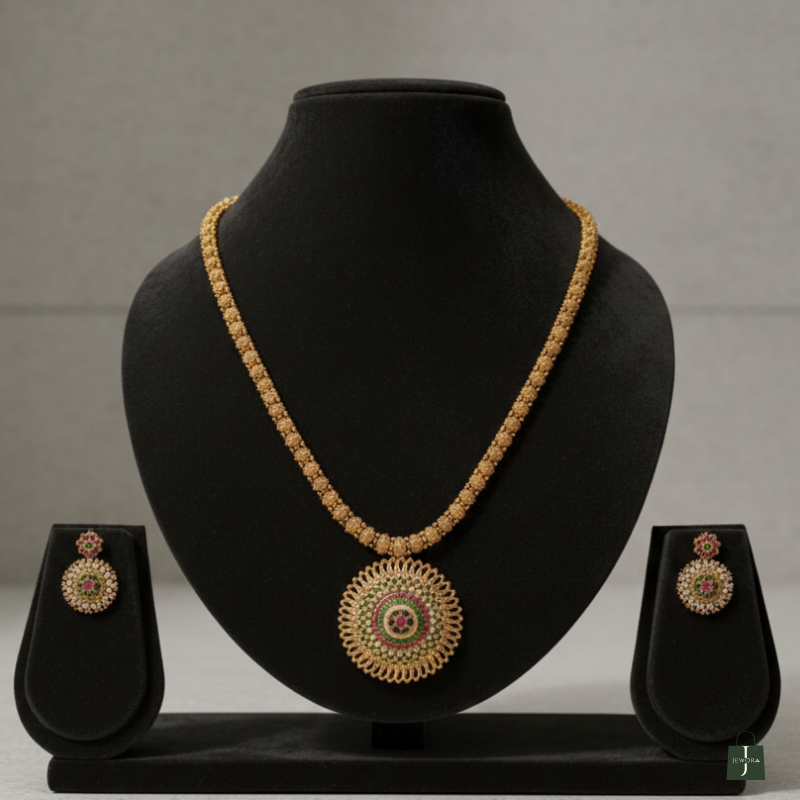 Capture the essence of traditional Indian artistry with this stunning gold-toned necklace and earring set. Inspired by classic temple jewelry designs, this piece features a thick, intricately woven chain leading to a spectacular circular pendant.