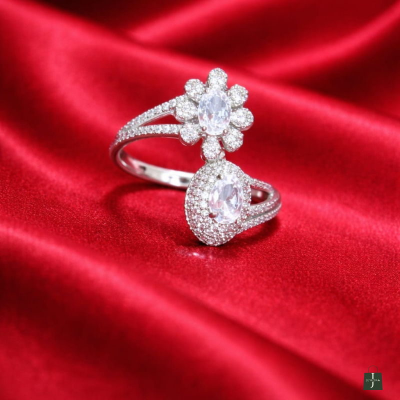 This zircon white adjustable ring shines with floral grace and modern charm — designed to fit beautifully and glow with every movement.