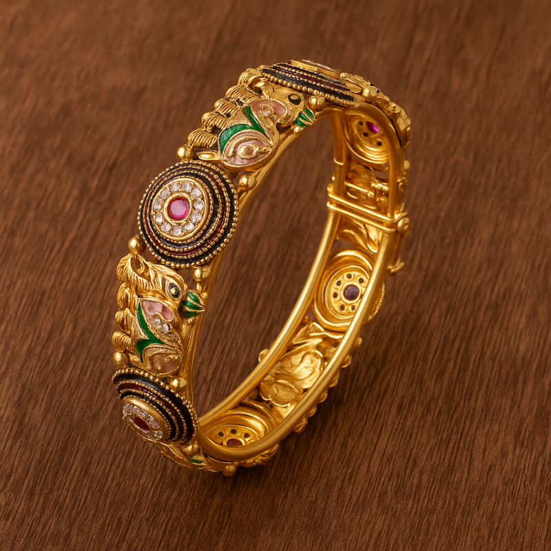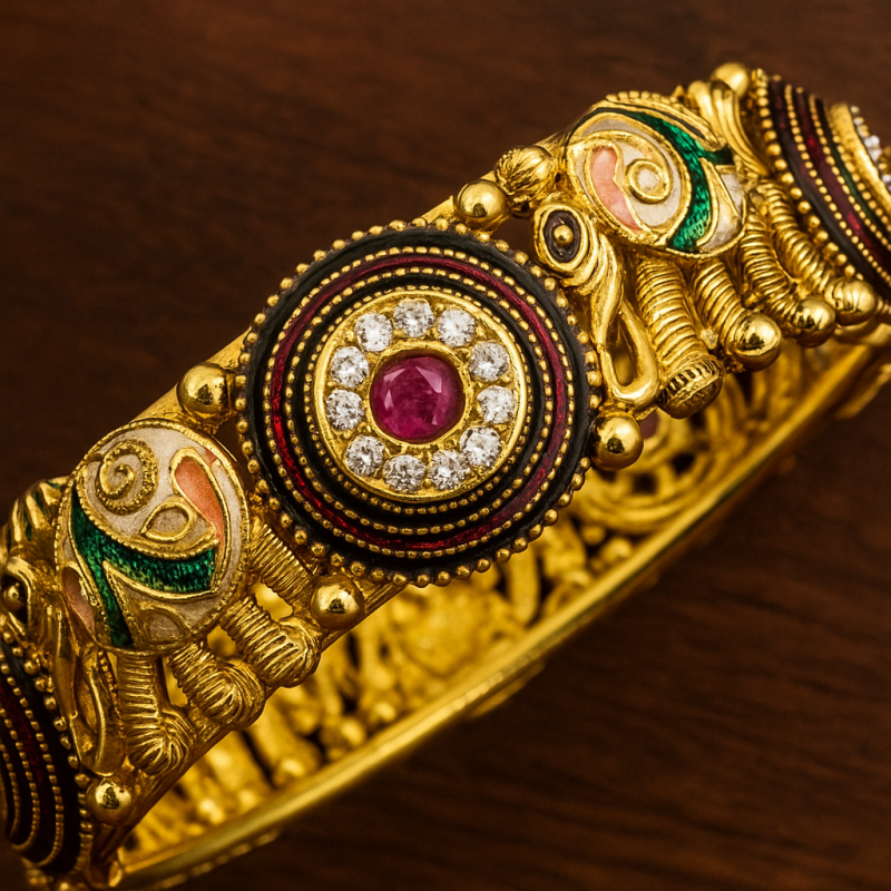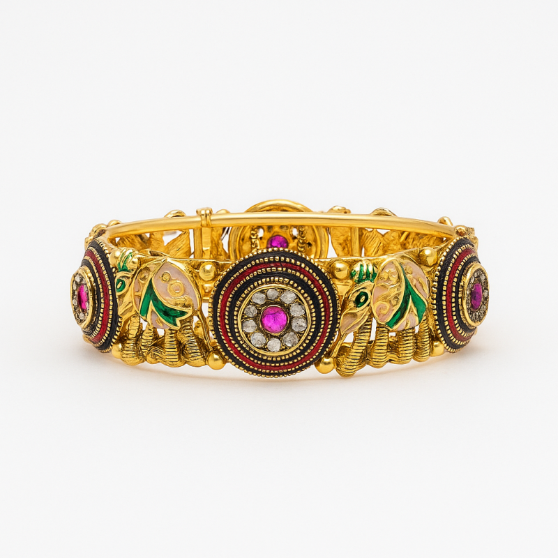 Bring heritage artistry to your collection with the Elephant Motif Temple Kada Bangle. Crafted with traditional temple jewelry detailing, this kada features beautifully carved elephant motifs symbolizing strength and prosperity. The bangle is adorned with Ruby stones and intricate enamel accents in green and red, finished with a radiant gold polish. With its secure screw closure, this kada is an exquisite choice for festive and bridal wear, reflecting timeless Indian craftsmanship.