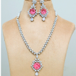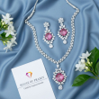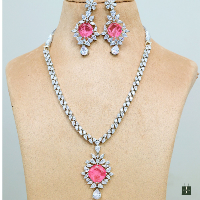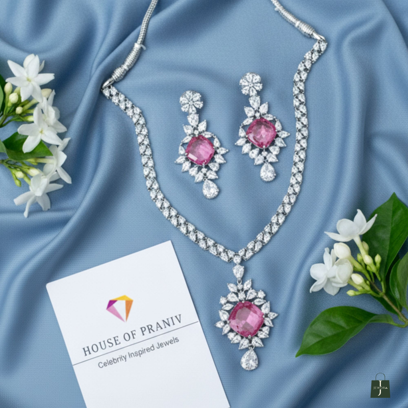 The ELVIRA ROSE PINK DIAMOND NECKLACE SET features a radiant rose-pink centre stone surrounded by shimmering diamond-style accents in an elegant silver-tone finish. Designed with a graceful drop pendant and perfectly coordinated statement earrings, this necklace set adds refined glamour to cocktail evenings, wedding receptions, engagements, and festive celebrations. A timeless choice that pairs beautifully with sarees, gowns, and contemporary ethnic ensembles, making every look effortlessly luxurious.