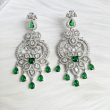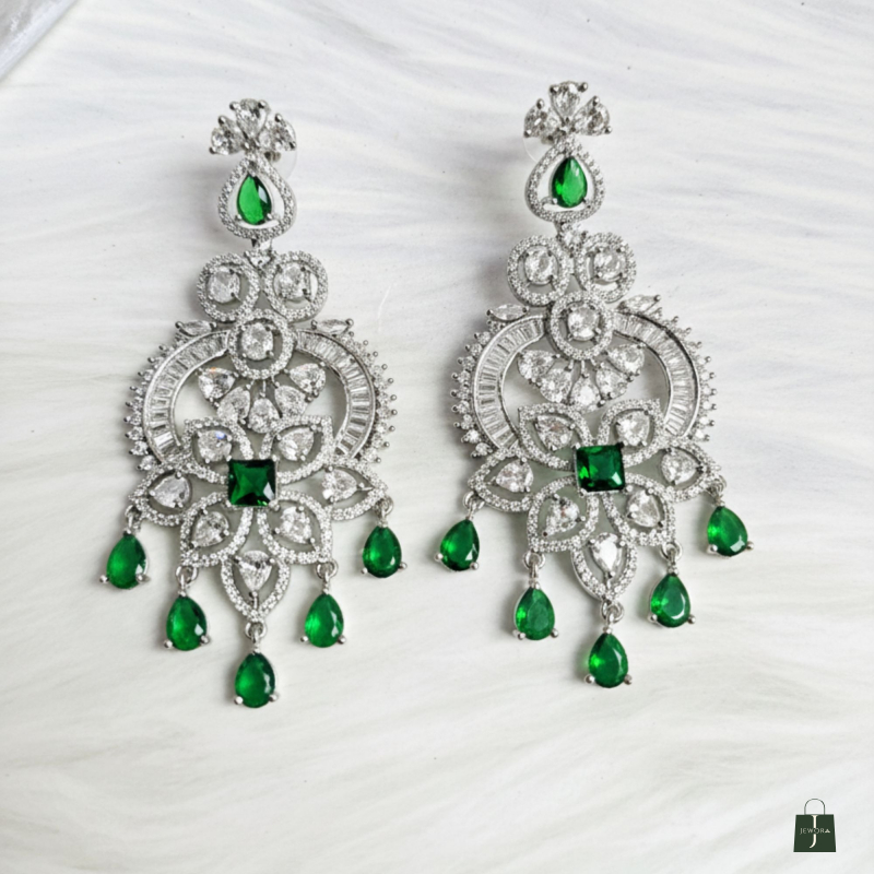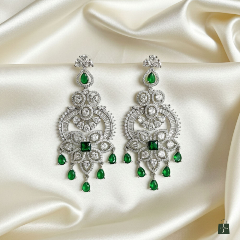 The EMERALD AMERICAN DIAMOND FLORAL DROP EARRINGS showcase an elegant floral design adorned with high-shine American diamonds and vibrant emerald-green drops, finished in a premium silver-tone polish. Perfect for weddings, receptions, and festive occasions, these statement earrings pair beautifully with sarees, lehengas, and contemporary Indian outfits, adding a touch of timeless sophistication.