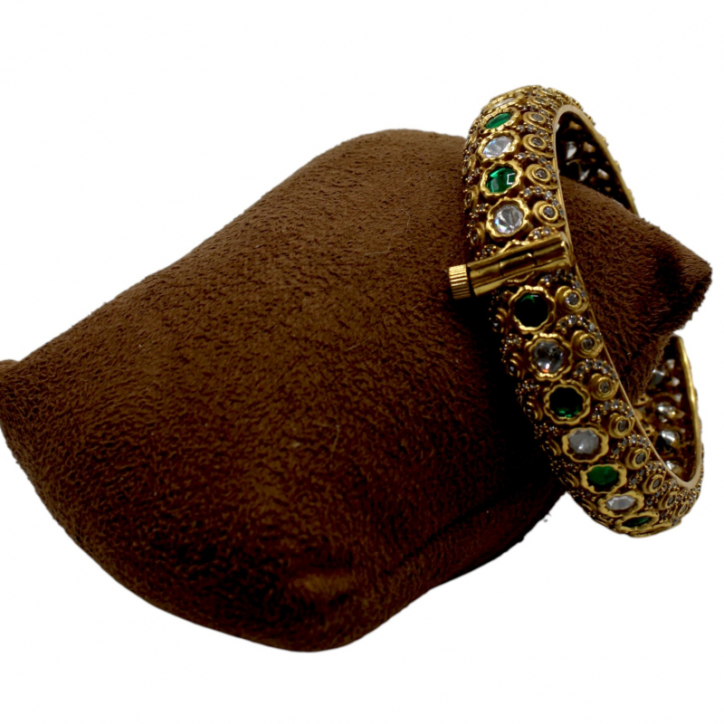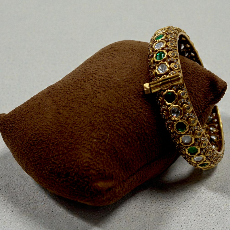 Elevate your traditional look with the Emerald Antique Polki Kada, a beautifully crafted statement piece inspired by royal heritage jewellery. Designed with intricate gold-toned detailing, this kada features a stunning combination of emerald green stones and shimmering polki accents arranged in an elegant circular pattern.