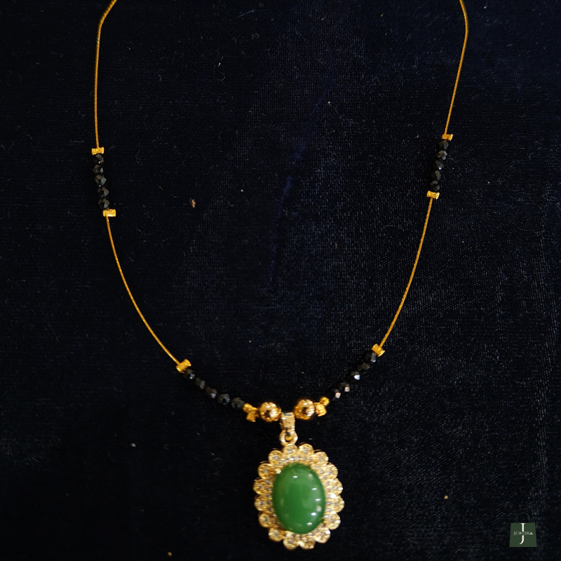 Grace meets elegance in this Emerald Aura Black Bead Pendant Necklace. Designed with a sleek gold-tone chain accented by delicate black beads, this piece beautifully blends traditional charm with contemporary styling.