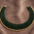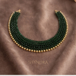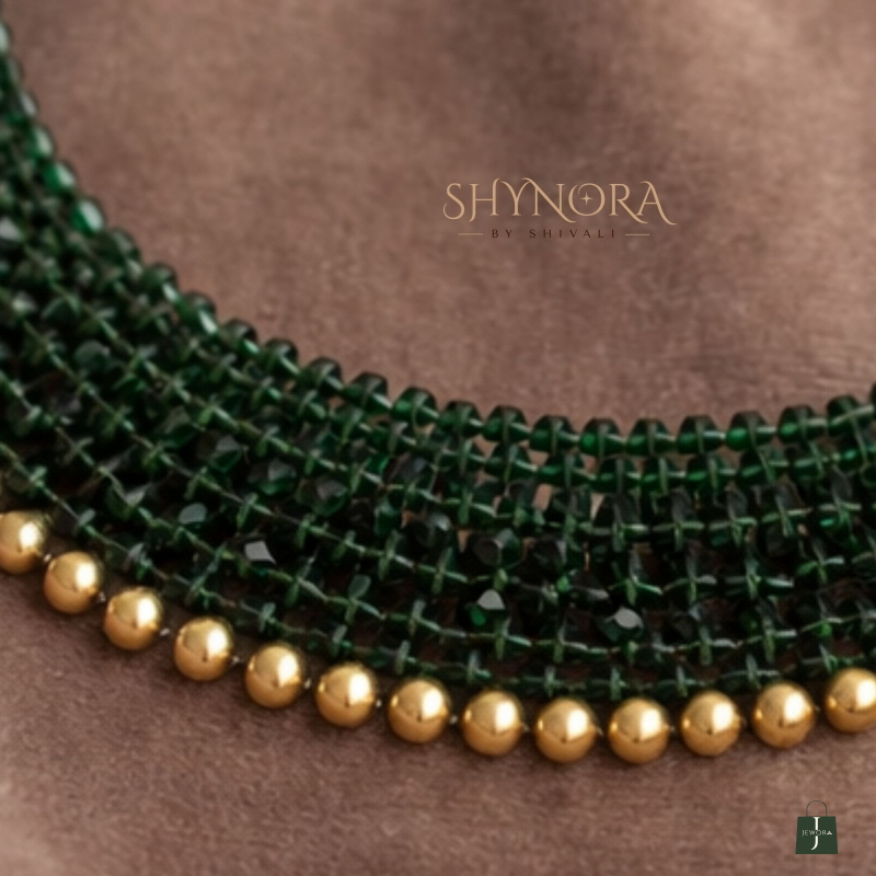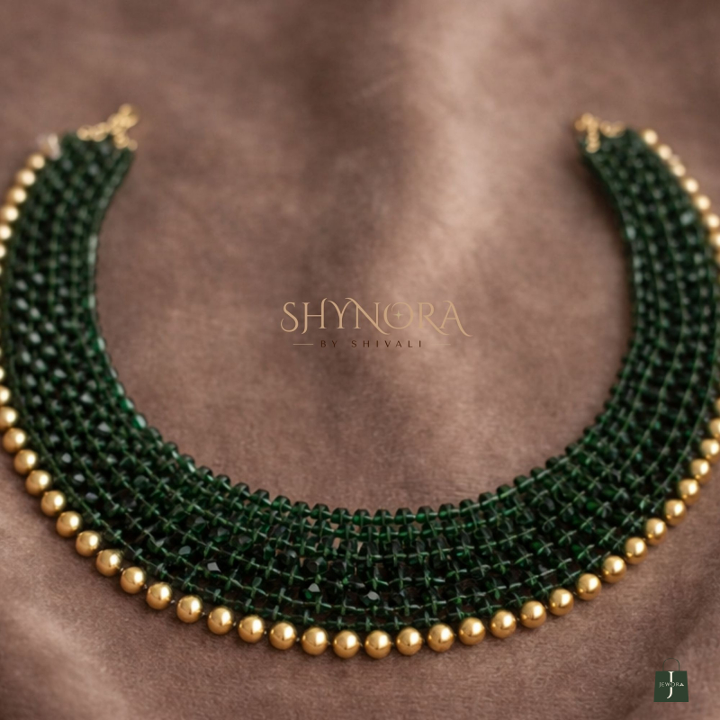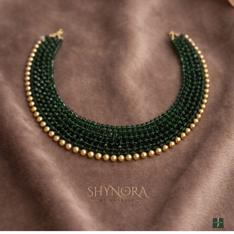 The Emerald Beaded Luxe Choker Necklace is a refined statement piece crafted with tightly handwoven deep emerald green beads, finished with a delicate line of gold-toned accents along the edge. Its sleek, collar-style silhouette sits gracefully on the neckline, offering a perfect balance of elegance and modern sophistication.