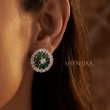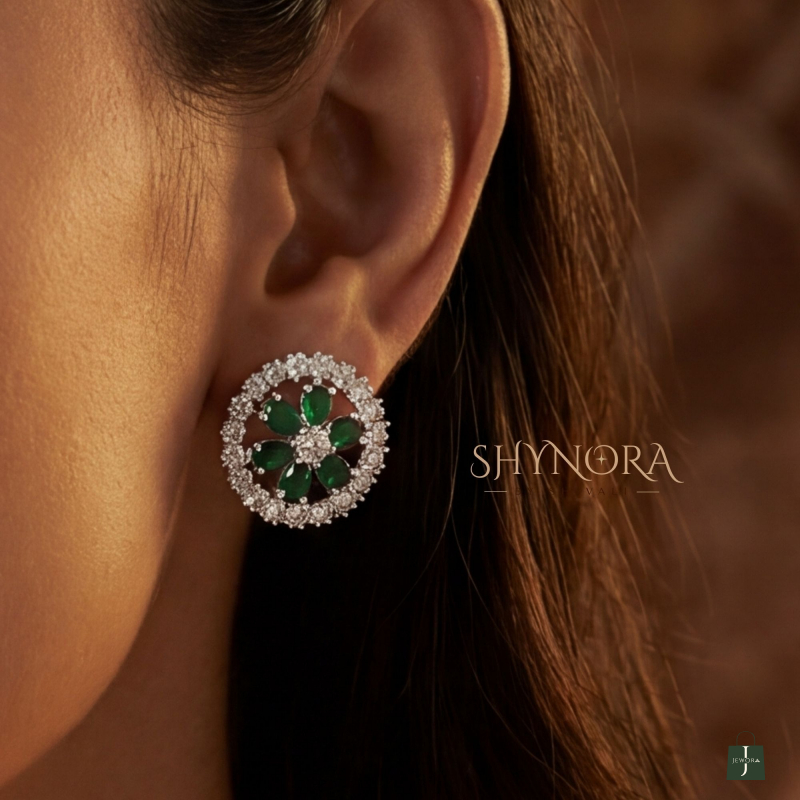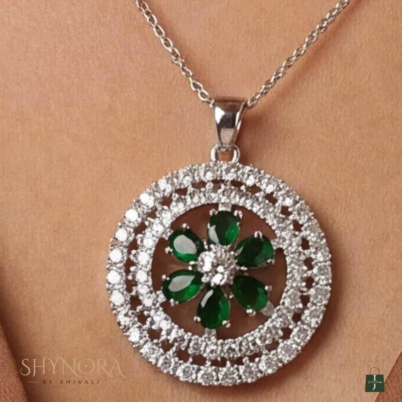 The Emerald Bloom Circular AD Pendant Set is a graceful blend of elegance and brilliance. Featuring rich emerald green teardrop stones arranged in a floral bloom at the center, the design is enhanced with a sparkling double halo of American Diamonds that adds depth and radiance.
