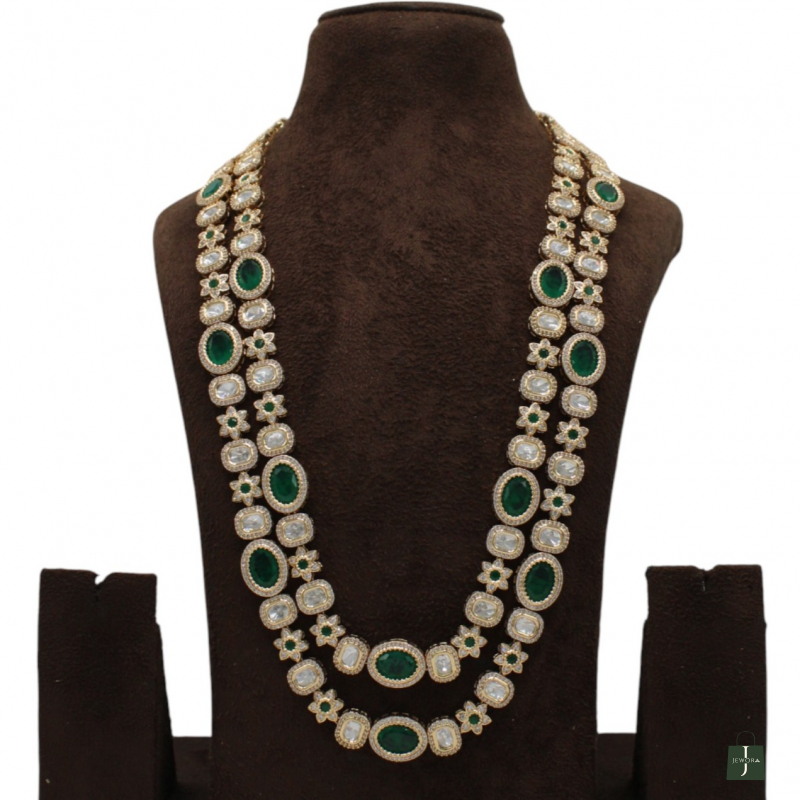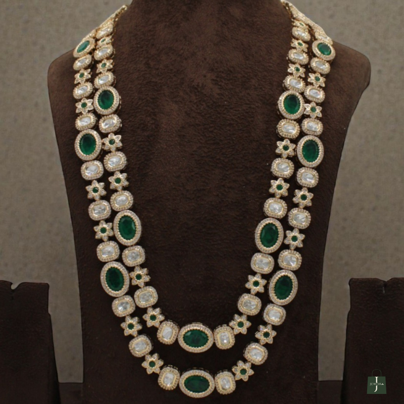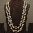 This stunning dual-layer necklace is crafted to reflect timeless elegance and royal charm. Featuring oval emerald green stones paired with radiant kundan settings, the design is beautifully enhanced with delicate floral motifs placed between each stone. The symmetrical layering creates a graceful drape, making it ideal for bridal wear, festive occasions, and grand celebrations.