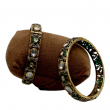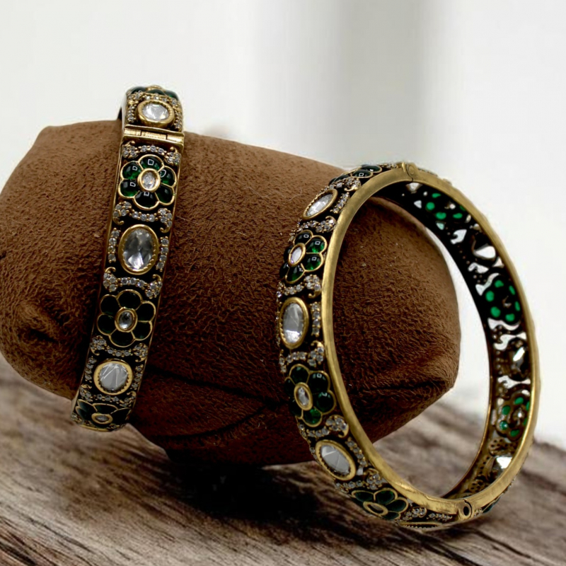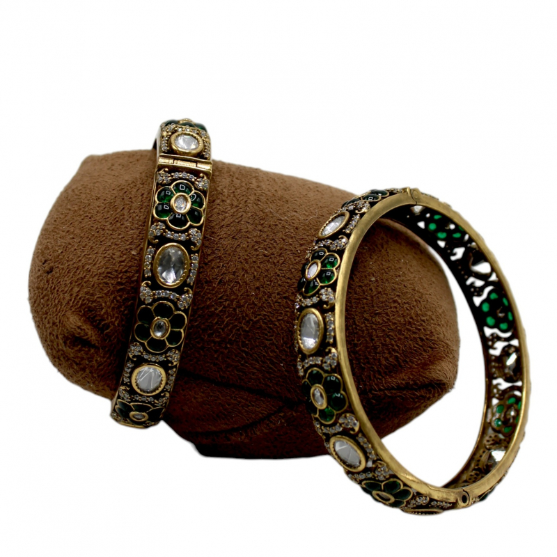 A beautifully crafted pair of traditional bangles featuring intricate floral motifs highlighted with rich green enamel work and sparkling kundan-style stones. The design alternates between oval polki settings and enamel flower patterns, bordered with delicate crystal accents. Finished in antique gold polish, these bangles radiate a royal vintage charm, making them perfect for weddings, festive occasions, and ethnic celebrations.