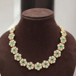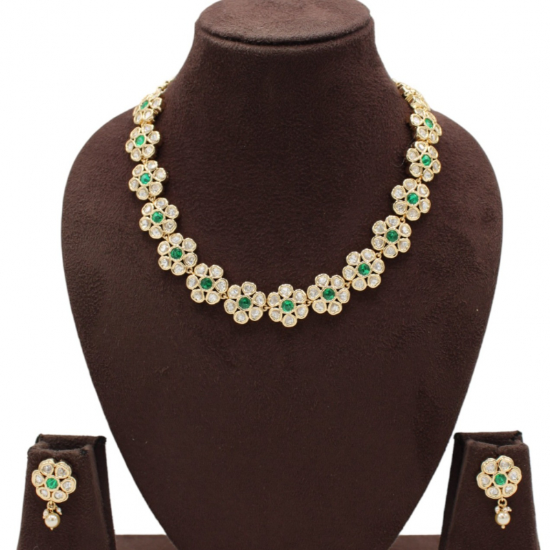 This beautifully crafted necklace set features delicate floral motifs arranged in a graceful curve, creating a refined and elegant neckline look. Each flower design is highlighted with a vibrant emerald-green center stone surrounded by sparkling white kundan-style stones, giving it a fresh and sophisticated appearance.