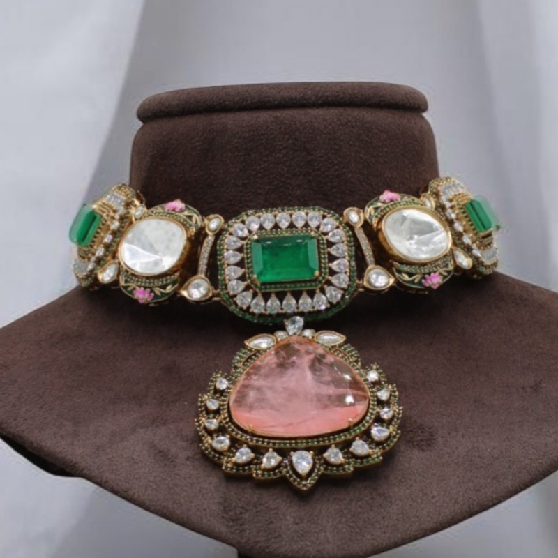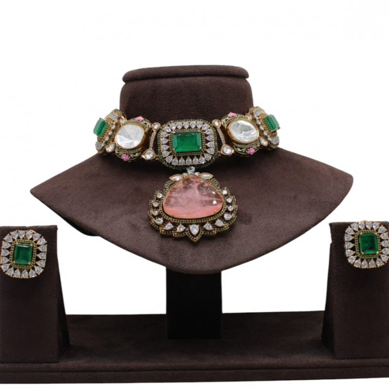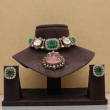 A luxurious statement choker set crafted with bold emerald-cut green stones, sparkling crystal borders, and a stunning blush pink centerpiece pendant. The structured design gives a regal and sophisticated appeal, while the soft pink drop adds a graceful contrast. Paired with matching stud earrings, this set is perfect for bridal and grand festive styling.