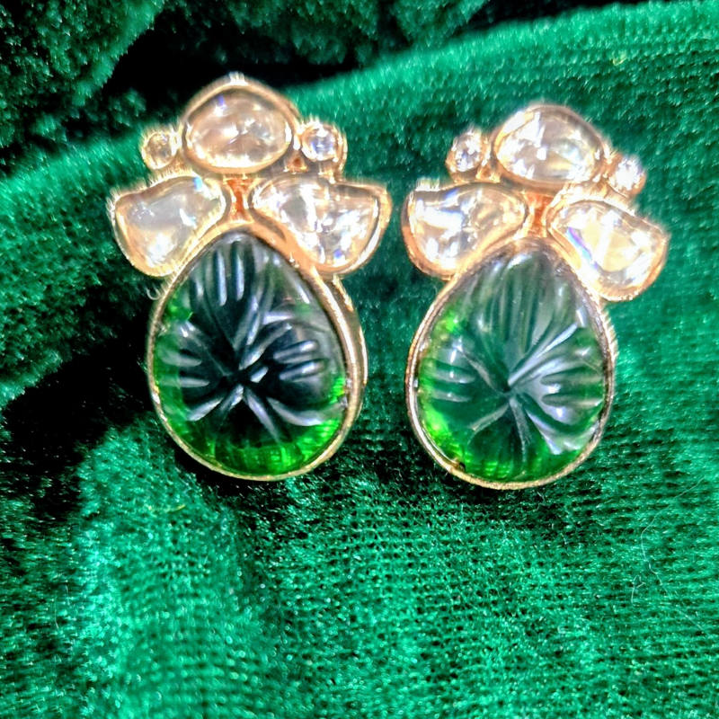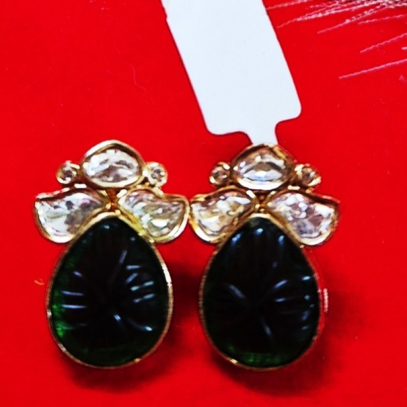 Add a touch of elegance to your jewelry collection with these beautifully crafted earrings featuring a rich green carved stone. The teardrop-shaped stone showcases intricate carving details, paired with a Kundan-style top adorned with clear stones for a refined traditional look. The gold-tone finish enhances the richness of the design, making these earrings perfect for both festive occasions and subtle ethnic styling. A perfect blend of classic craftsmanship and modern elegance.