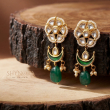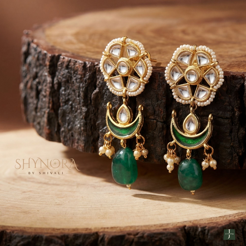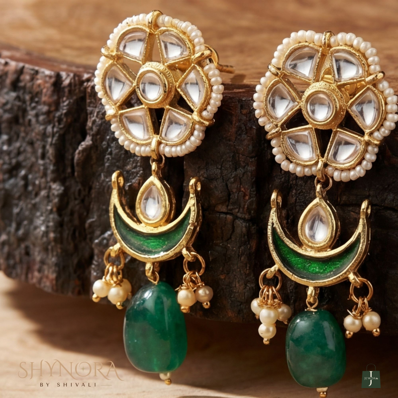 The Emerald Crescent Kundan Earrings showcase a graceful blend of traditional charm and refined elegance. Designed with a floral kundan stud bordered by delicate pearl beading, these earrings flow into a crescent-shaped green enamel motif highlighted with a teardrop kundan stone. Finished with tiny pearl accents and a deep green bead drop, they offer beautiful movement and a regal ethnic appeal.