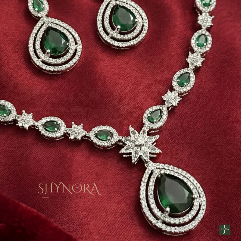 Grace your look with timeless elegance through this Emerald Dewdrop AD Floral Necklace Set, beautifully designed for refined festive and occasion wear. The necklace showcases a delicate sequence of emerald green oval stones, accented with sparkling floral American Diamond motifs that flow seamlessly into a striking teardrop emerald pendant.