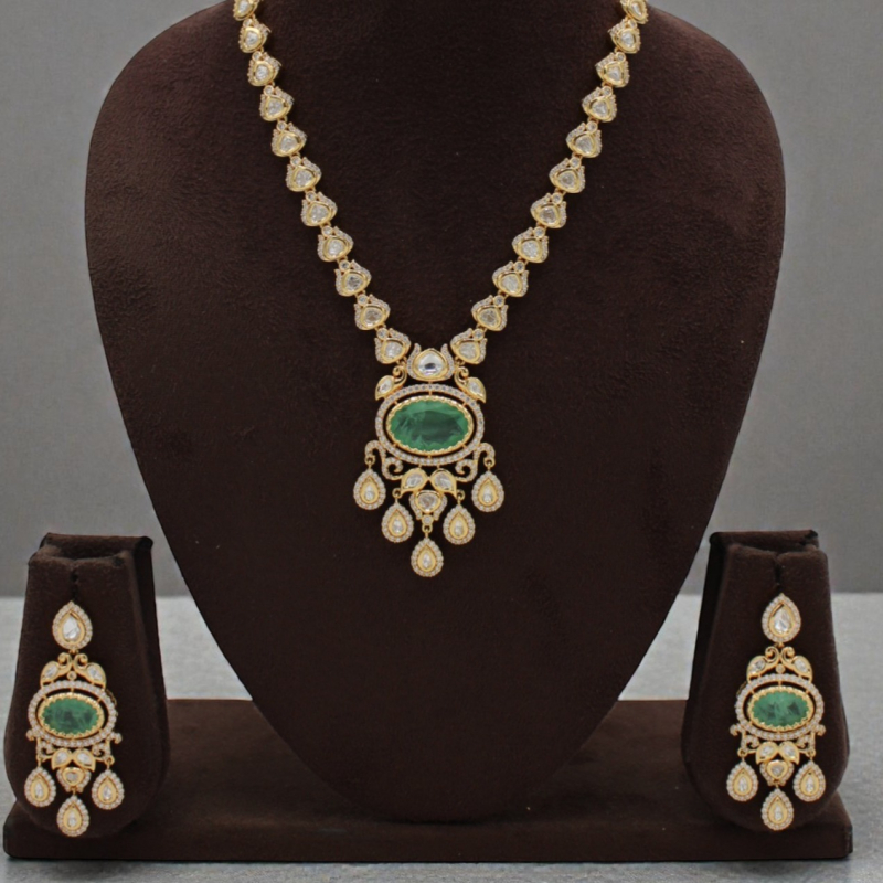 Add refined elegance to your traditional look with this beautiful Emerald Drop Kundan Pendant Necklace Set. Designed with a delicate chain of heart-shaped Kundan links, this necklace features a stunning oval emerald-green center stone pendant surrounded by sparkling white Kundan detailing.