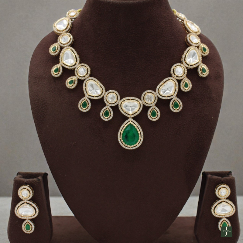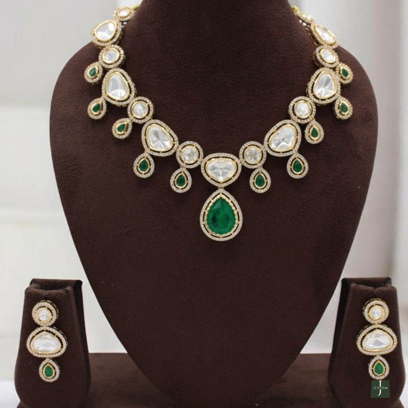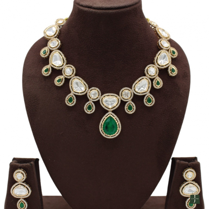 Elevate your traditional look with this luxurious Kundan Necklace Set, beautifully crafted with classic white pear-shaped stones and highlighted with rich emerald green drop accents. The necklace features a graceful cascading design with round connectors and teardrop danglers, finished with a bold emerald green center pendant that adds royal charm.
