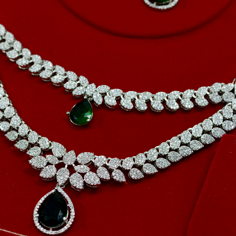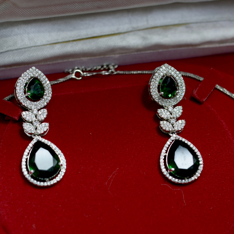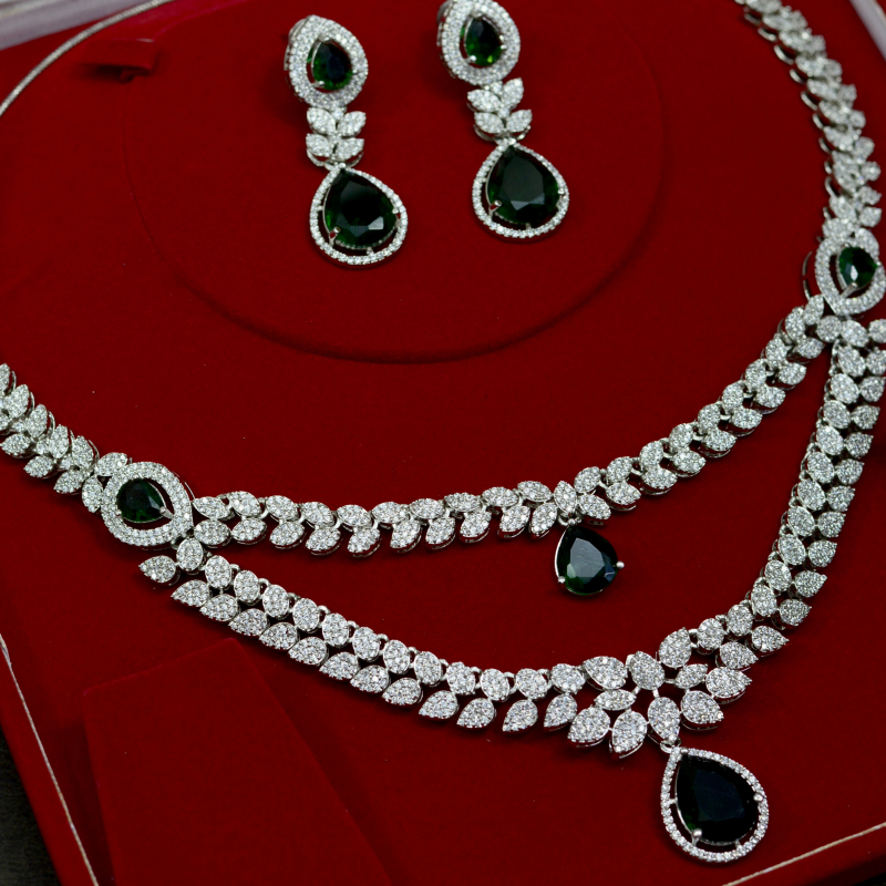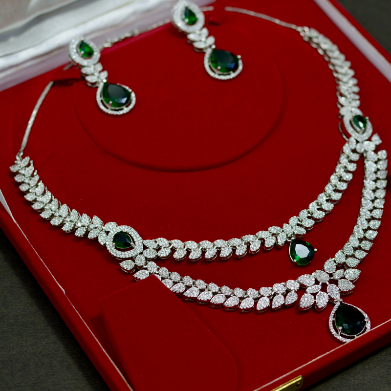 Designed with leaf-inspired motifs and rich emerald drop stones, this necklace set radiates natural elegance and sophistication. The detailed craftsmanship and balanced shine give it a high-end appearance, while its comfortable wear and accessible pricing make it perfect for celebrations, parties, and graceful traditional outfits.