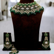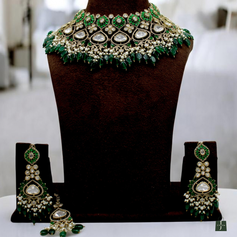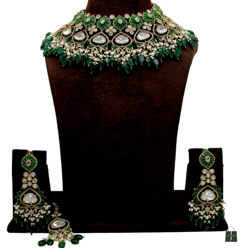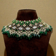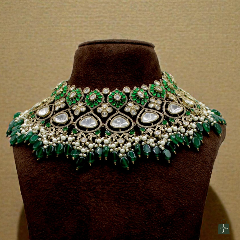 Elevate your ethnic look with this stunning emerald green Kundan choker set, crafted to exude elegance and grandeur. The necklace features intricately arranged teardrop-shaped Kundan stones surrounded by vibrant green crystals and delicate pearl clusters. The lower edge is beautifully adorned with green bead drops and pearl hangings, giving it a rich and luxurious finish.