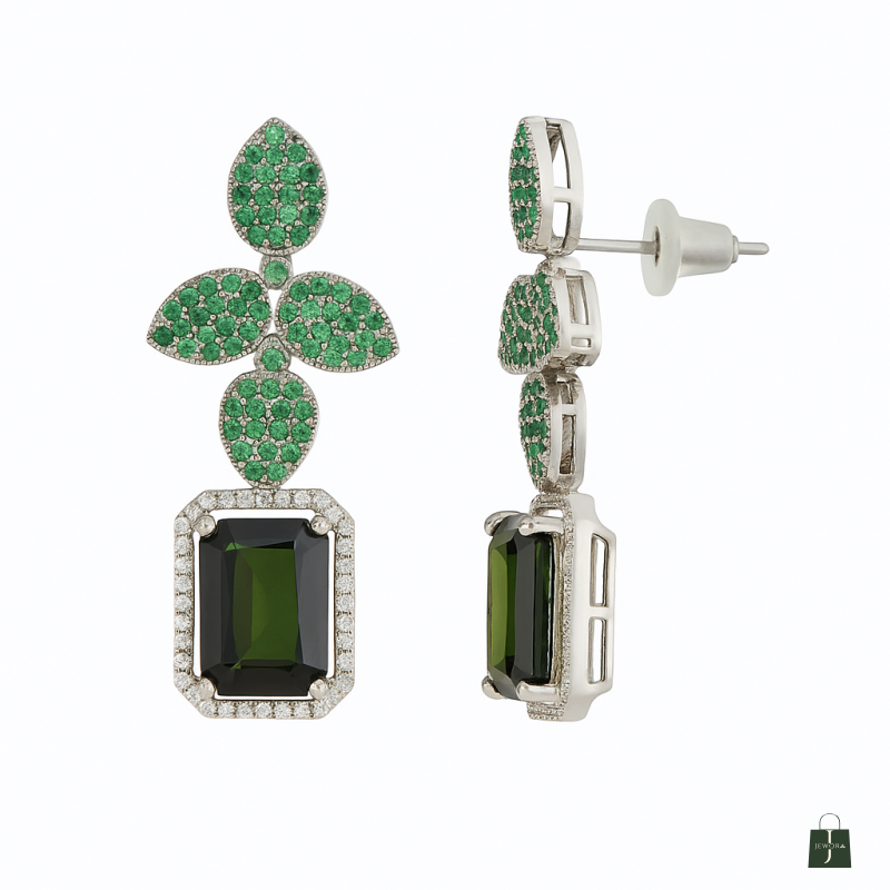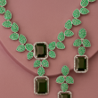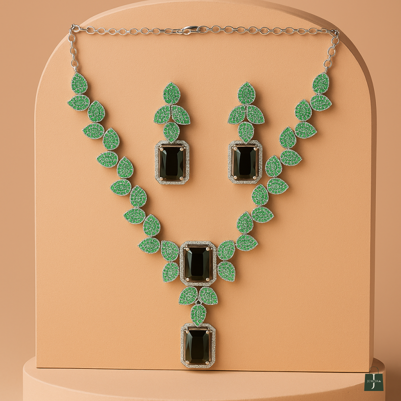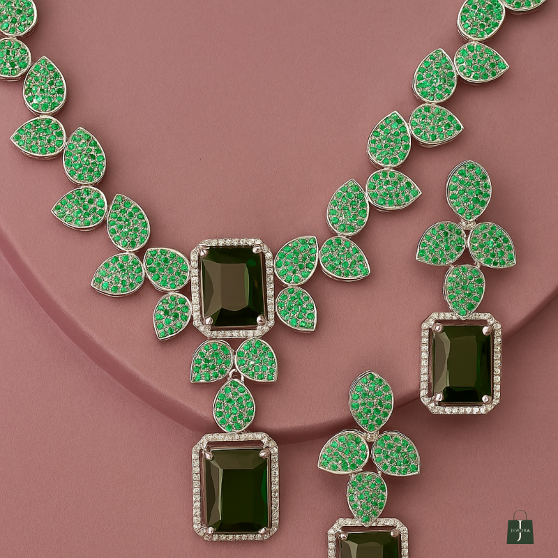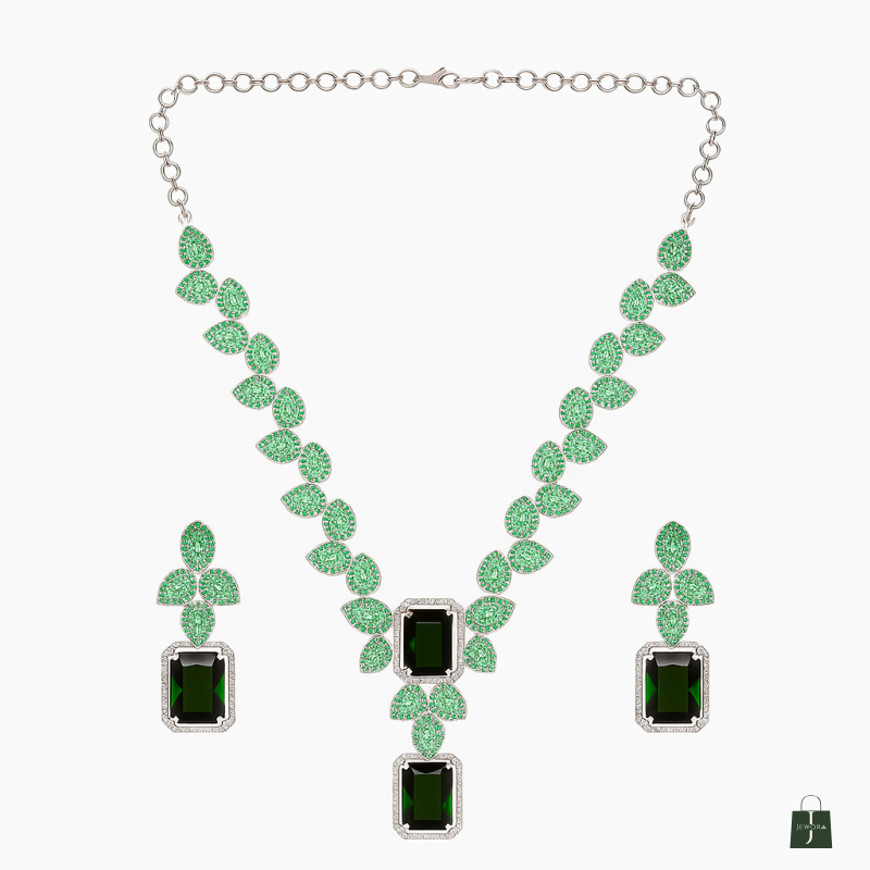 Step into elegance with our Emerald Garden Radiance Set, designed to capture the freshness of nature with its lush green leaf-inspired motifs. The necklace features a stunning cascade of emerald-hued stones, each surrounded by shimmering white accents, forming a graceful garden-like pattern. The centerpiece showcases dual emerald-cut stones framed in sparkling brilliance, creating a bold yet refined focal point.