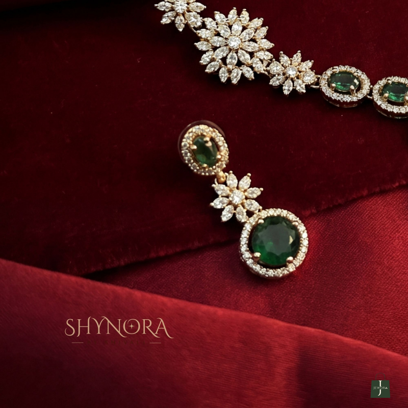 Delicate floral clusters along the necklace add charm and detail, while the central emerald drop pendant creates a refined focal point. The matching earrings mirror the same floral and drop design, making this set perfect for weddings, festive occasions, and traditional celebrations.