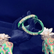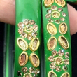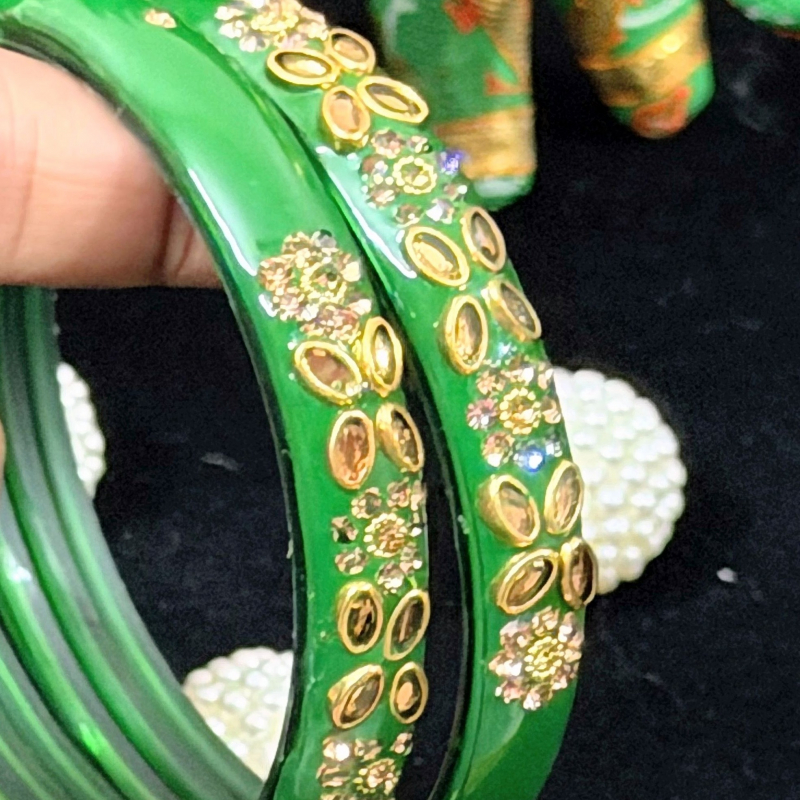 This stunning pair of green enamel bangles features intricate floral kundan work with a rich gold polish finish. The glossy green base enhances the brilliance of champagne-toned stones, arranged in delicate floral and oval motifs. Perfect for festive occasions, weddings, and traditional outfits, these bangles add a royal and graceful charm to your look.