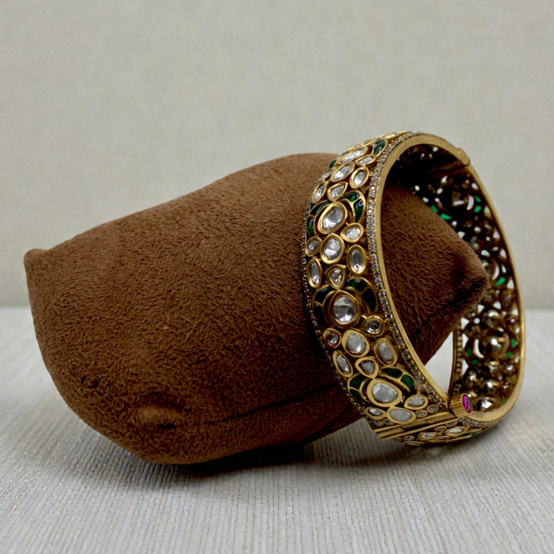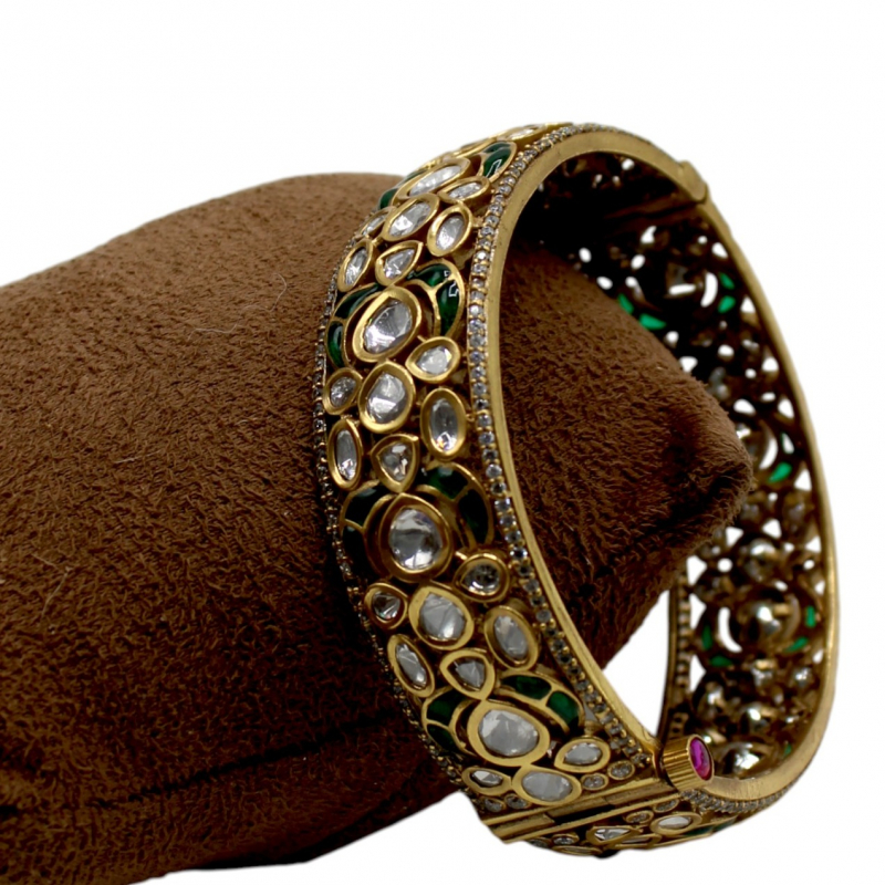 Add timeless elegance to your jewellery collection with this beautifully handcrafted Kundan Polki bangle. Designed with intricate floral patterns, this statement piece features sparkling uncut stones highlighted with rich green accents. The detailed craftsmanship and premium gold polish give it a luxurious royal appeal, perfect for weddings, festive occasions, and traditional functions.