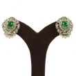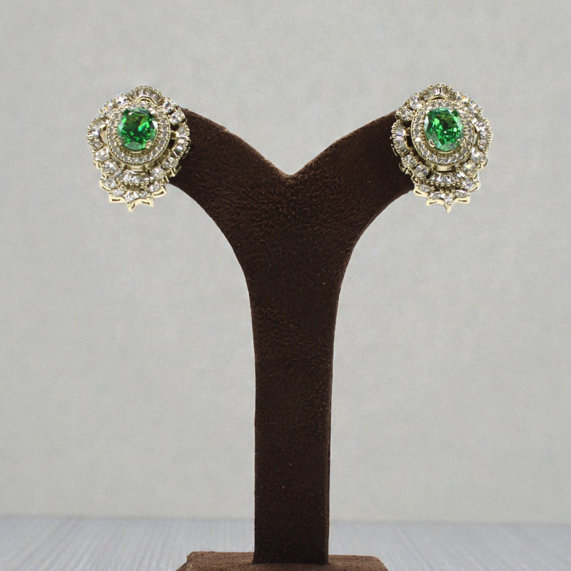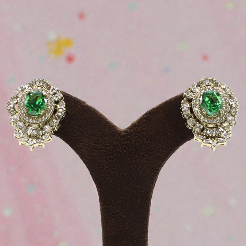 Enhance your look with these luxurious emerald-green stone stud earrings crafted in a detailed halo setting. The vibrant oval-cut green center stone is surrounded by sparkling white micro stones arranged in an intricate layered pattern, giving a rich and classy appeal. Perfect for festive occasions, wedding functions, and party wear styling.