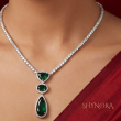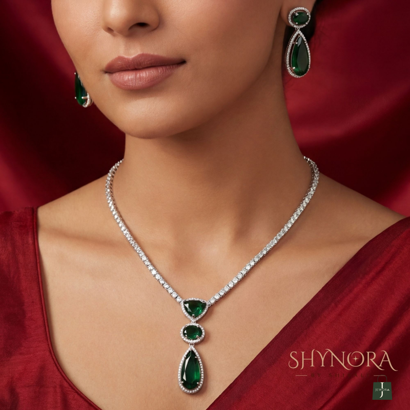 Elevate your elegance with this Emerald Grace AD pendant necklace set, crafted for lovers of refined and minimal luxury. The necklace features a sleek diamond-style chain highlighted by a graceful drop pendant showcasing rich emerald green stones in a layered heart, oval, and teardrop design, beautifully framed with sparkling AD (American Diamond) accents.