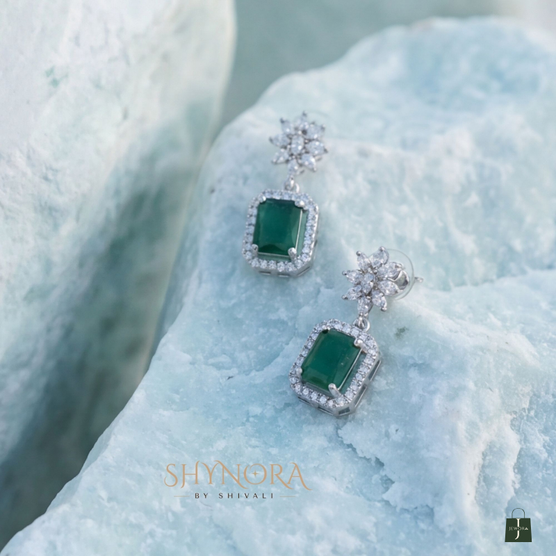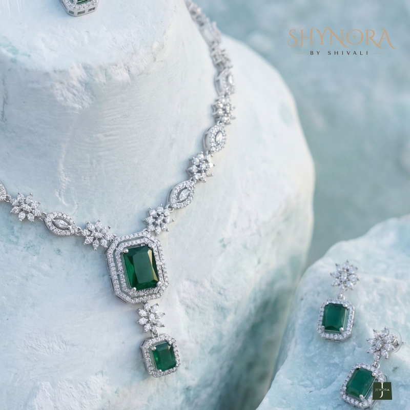 Add timeless charm to your jewelry collection with this Emerald Grace necklace set, crafted to reflect refined elegance and modern luxury. Featuring rich emerald-green rectangular stones highlighted by sparkling diamond-finish accents, this design offers a graceful drop silhouette that enhances the neckline beautifully.