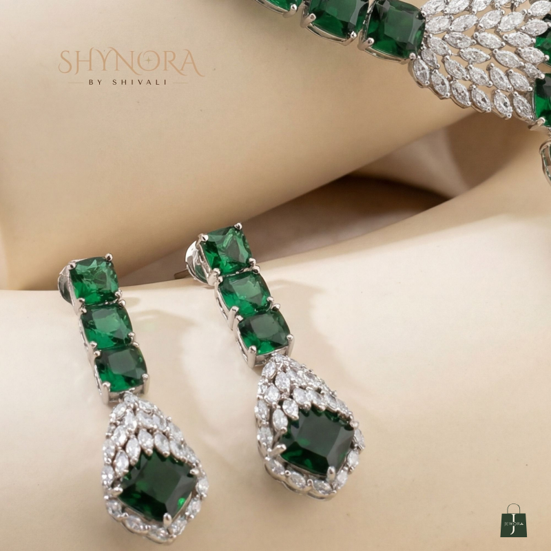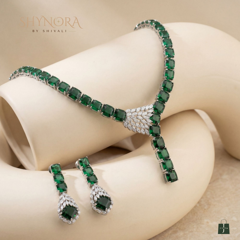 The Emerald Grace Drop Necklace Set is a refined statement of elegance and modern glamour. Featuring a sleek line of deep emerald-green stones, this necklace flows into a graceful Y-shaped drop, highlighted with a sparkling diamond-style crystal cluster at the center for a luxe finish.