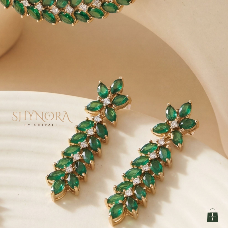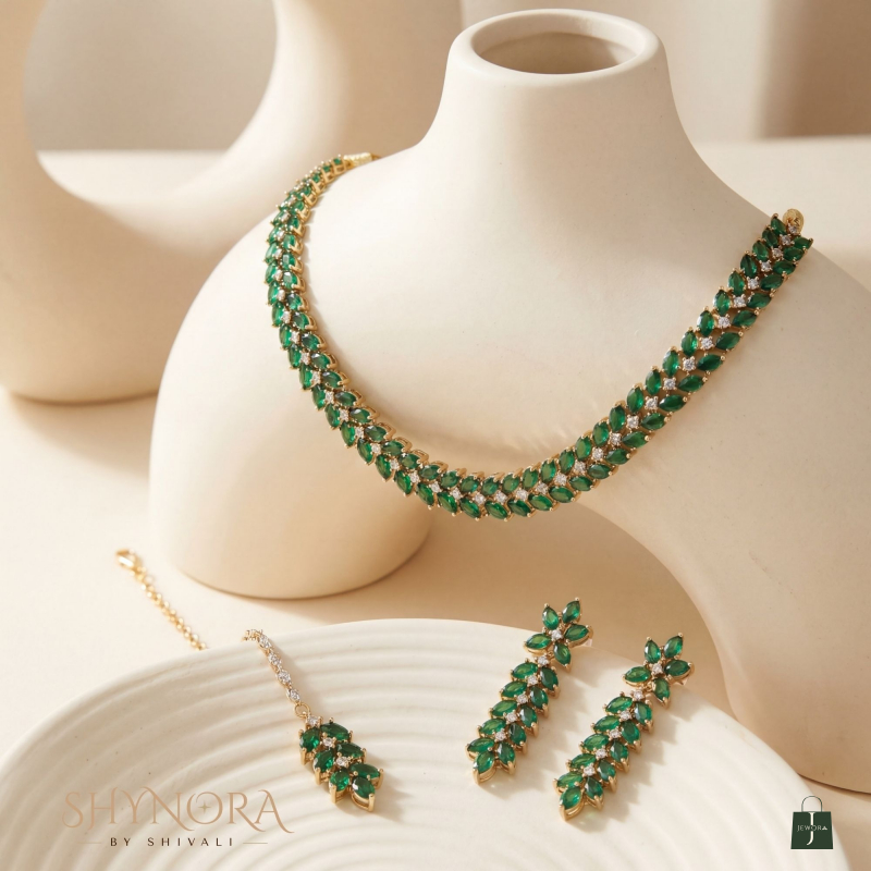 This graceful American Diamond (AD) necklace set features a sleek leaf-inspired pattern highlighted with rich emerald green stones and delicate white accents. The elegant curve of the necklace sits beautifully on the neckline, offering a refined and classy look.