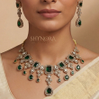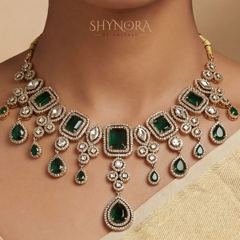 Elevate your ethnic look with this exquisite Emerald Green American Diamond Necklace Set, crafted to perfection with deep green stones and sparkling AD accents. The necklace features a regal arrangement of square and teardrop-shaped emerald green stones, beautifully highlighted with shimmering clear stones in a luxurious gold-tone finish.