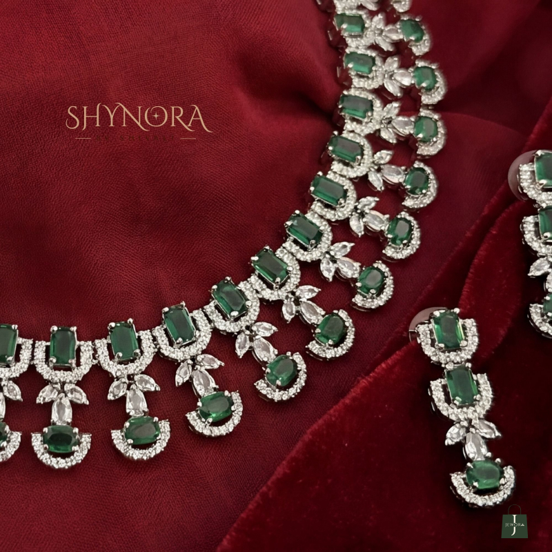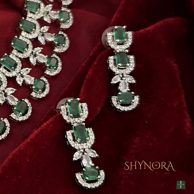 Elevate your look with this elegant Emerald Green Crystal Choker Necklace Set, crafted with deep emerald green rectangular and round stones highlighted by sparkling clear crystals in a polished silver-tone finish. The choker features a graceful layered pattern with delicate drop detailing, giving it a refined yet eye-catching appeal.