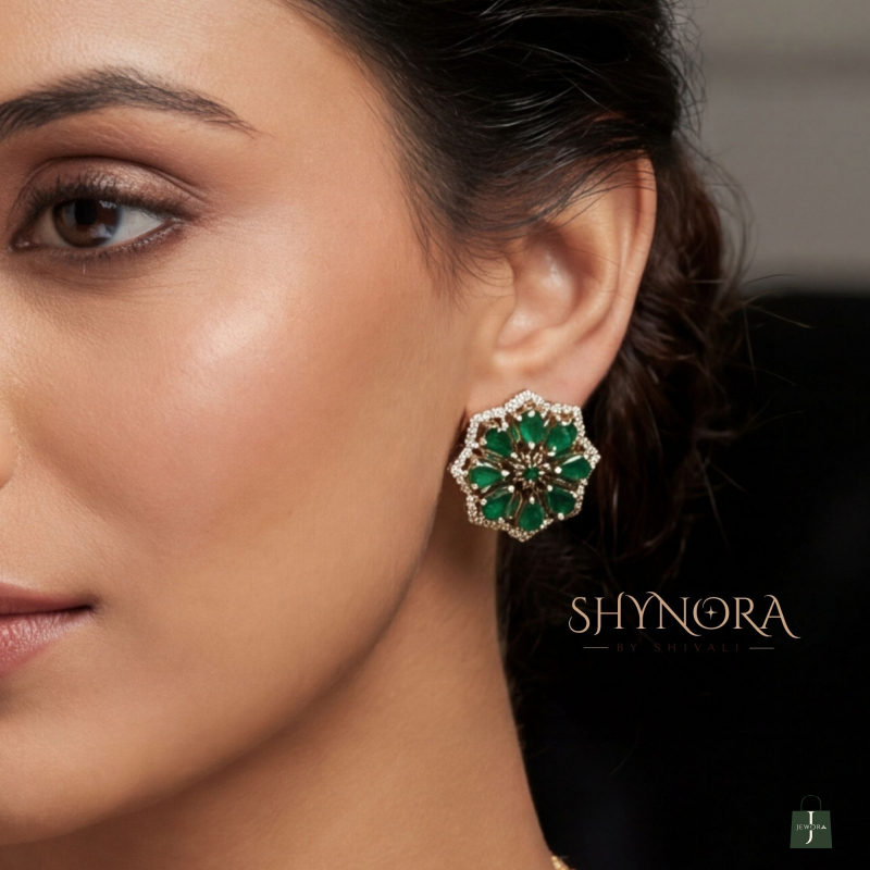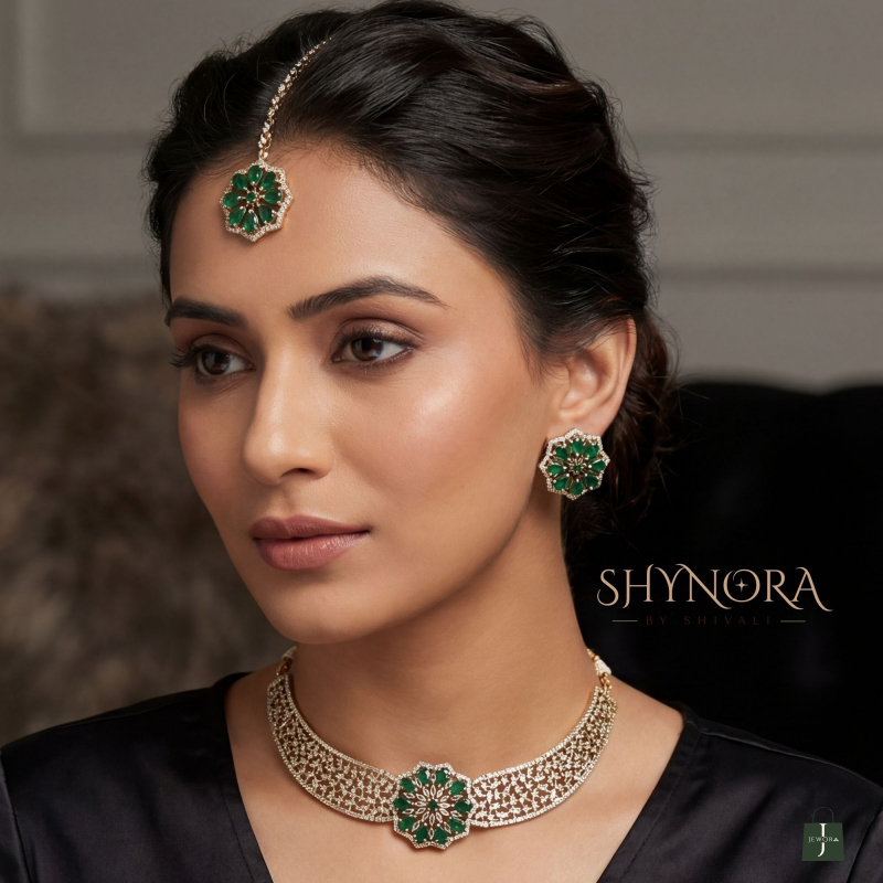 The Emerald Green Floral AD Choker Set is a graceful and elegant jewelry set, perfect for weddings and festive occasions. The choker features a gold-finish lattice design beautifully decorated with sparkling American Diamonds and a rich emerald green floral centerpiece that gives it a royal look.