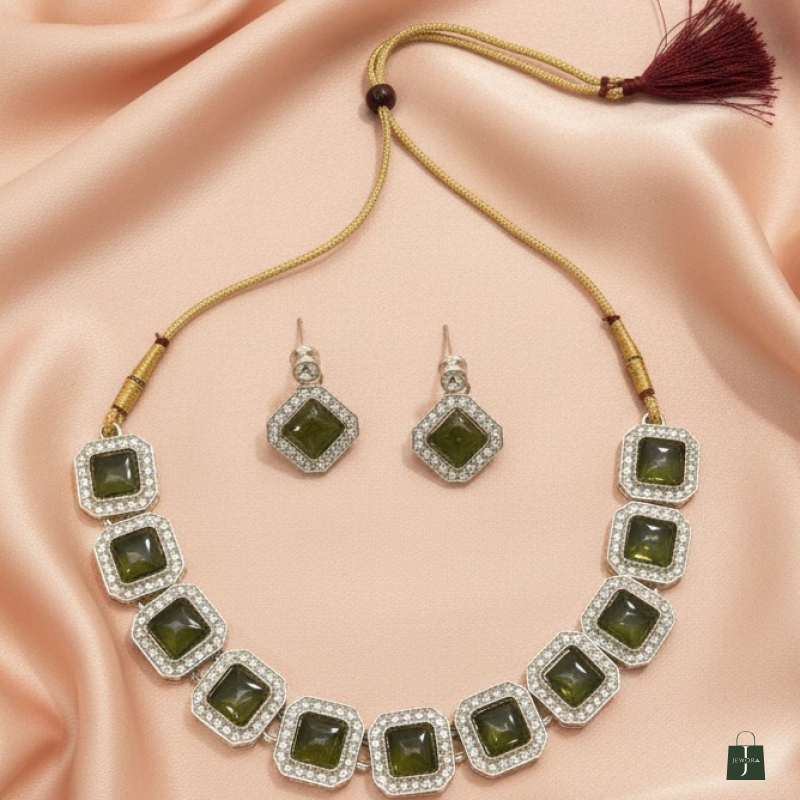 The Emerald Green Kundan Square Necklace Set is a perfect blend of modern elegance and royal charm. Designed with premium brass alloy and finished with luxurious rhodium polish, this necklace features striking olive green cushion-cut hydro stones that are beautifully framed with sparkling American diamonds. The clean square pattern gives the set a contemporary and classy look, making it suitable for both ethnic and Indo-western outfits.