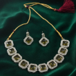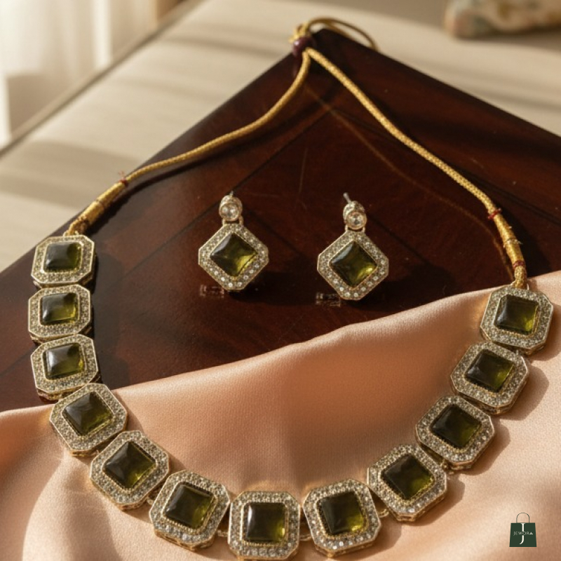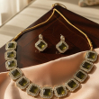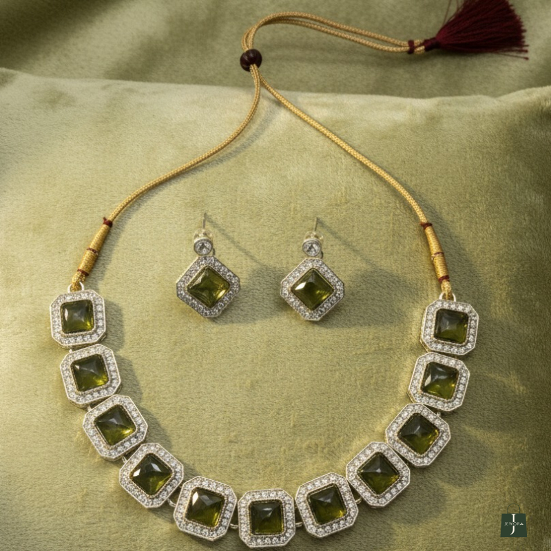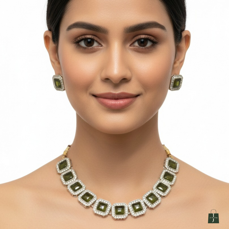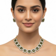 This green stone necklace pairs beautifully with sarees, gowns, lehengas, and pastel or dark-toned outfits. Its subtle sparkle and modern design make it an ideal choice for women who prefer statement jewellery with a sophisticated and luxurious feel.