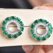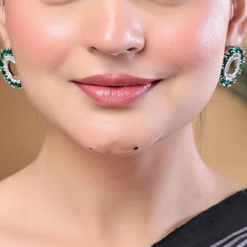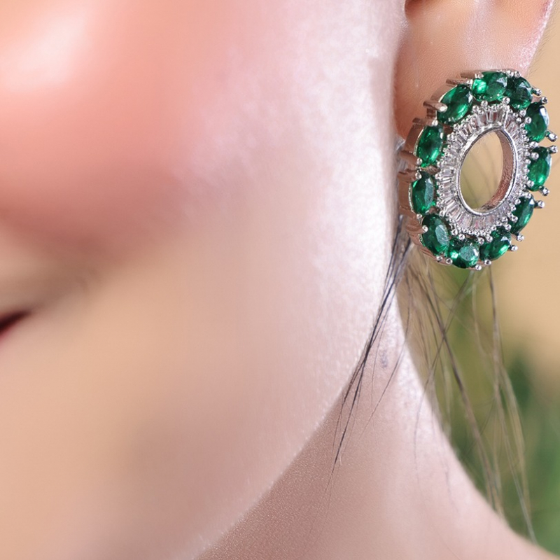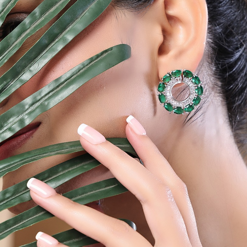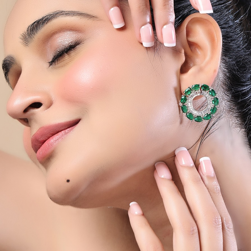 These Emerald Halo Shine Studs showcase a stunning circular design that radiates elegance and brilliance. At the center lies a vibrant emerald green stone, beautifully encircled by sparkling white stones that enhance its luminous appeal. The sleek silver polish adds a modern and refined touch, perfectly complementing the rich green hue. Designed to catch the light from every angle, these studs offer a dazzling shine that elevates any look. Ideal for both everyday wear and special occasions, they are lightweight, comfortable, and timeless in style. A perfect choice to add sophistication and a pop of color to your jewelry collection.