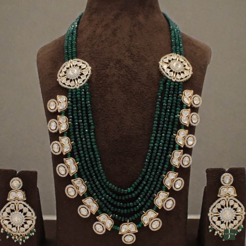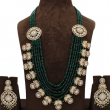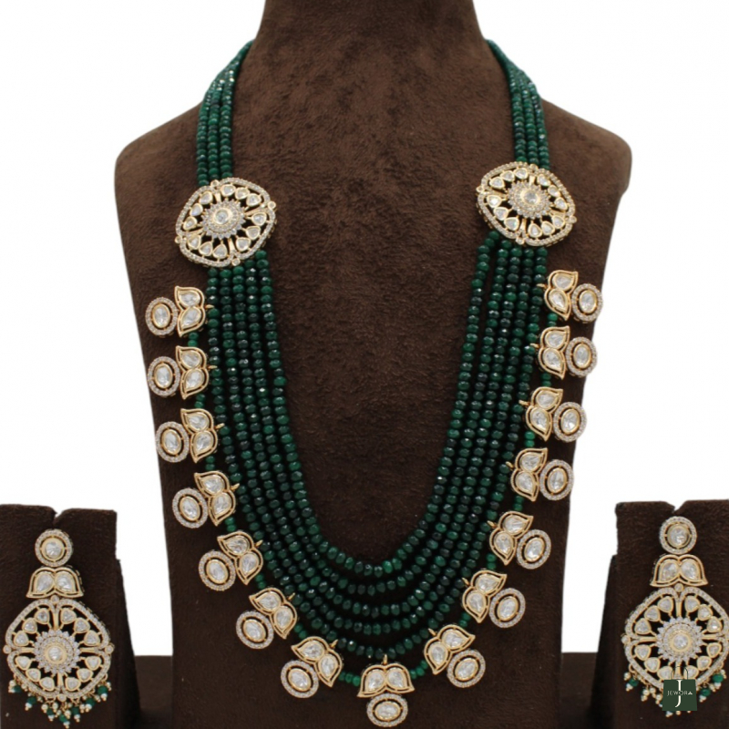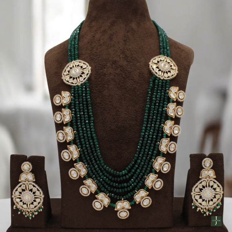 Add timeless elegance to your bridal and festive wardrobe with this luxurious multi-layer beaded necklace set. Designed with rich emerald green bead strands, this masterpiece is beautifully highlighted with intricate Polki Kundan motifs placed along the sides and neckline.