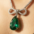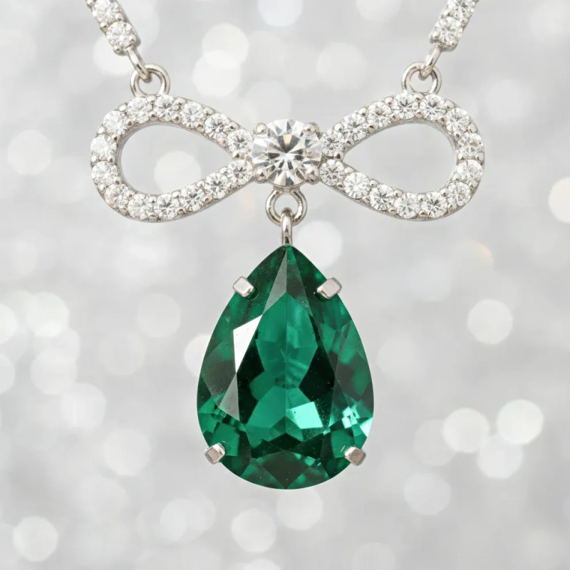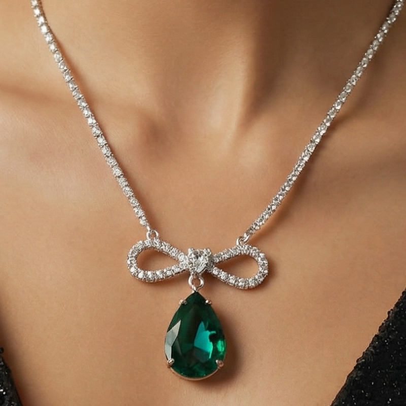 A slender rhinestone chain catches the light with every movement, leading to an infinity bow at the center — a soft symbol of endless charm. From it falls a radiant emerald-toned drop crystal, rich in colour and depth, reflecting light with refined brilliance as it rests along the neckline.