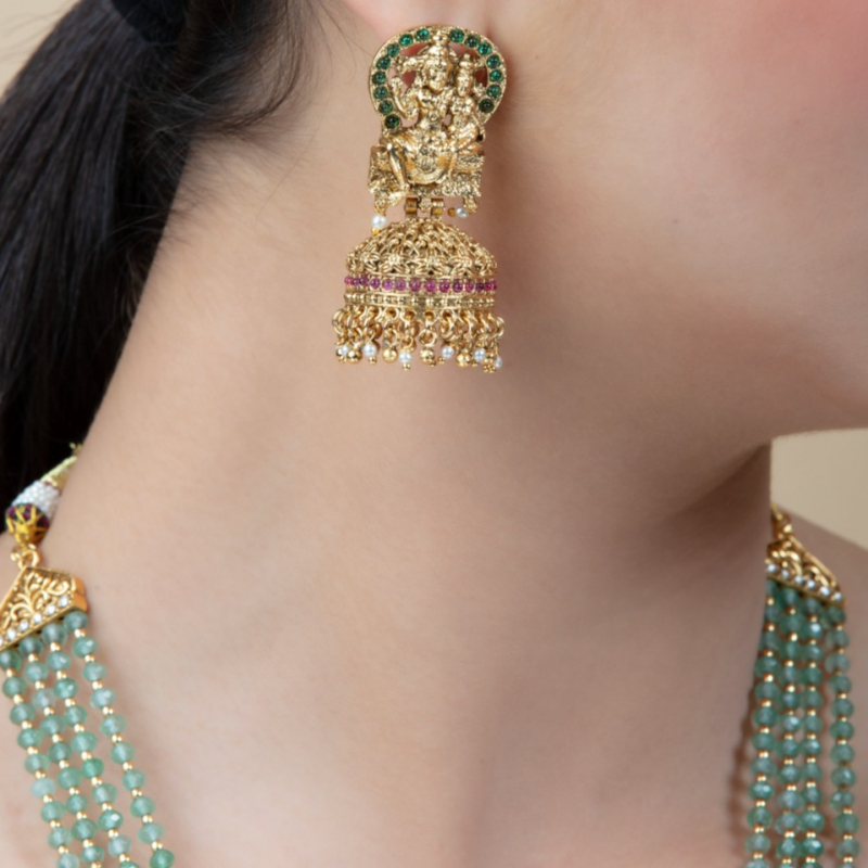 The centerpiece features an intricately carved Lakshmi pendant, symbolizing prosperity and divine beauty, adorned with fine detailing and elegant bead danglers. The matching jhumka earrings complement the necklace perfectly with traditional dome design, green and ruby accents, and intricate gold work.