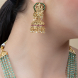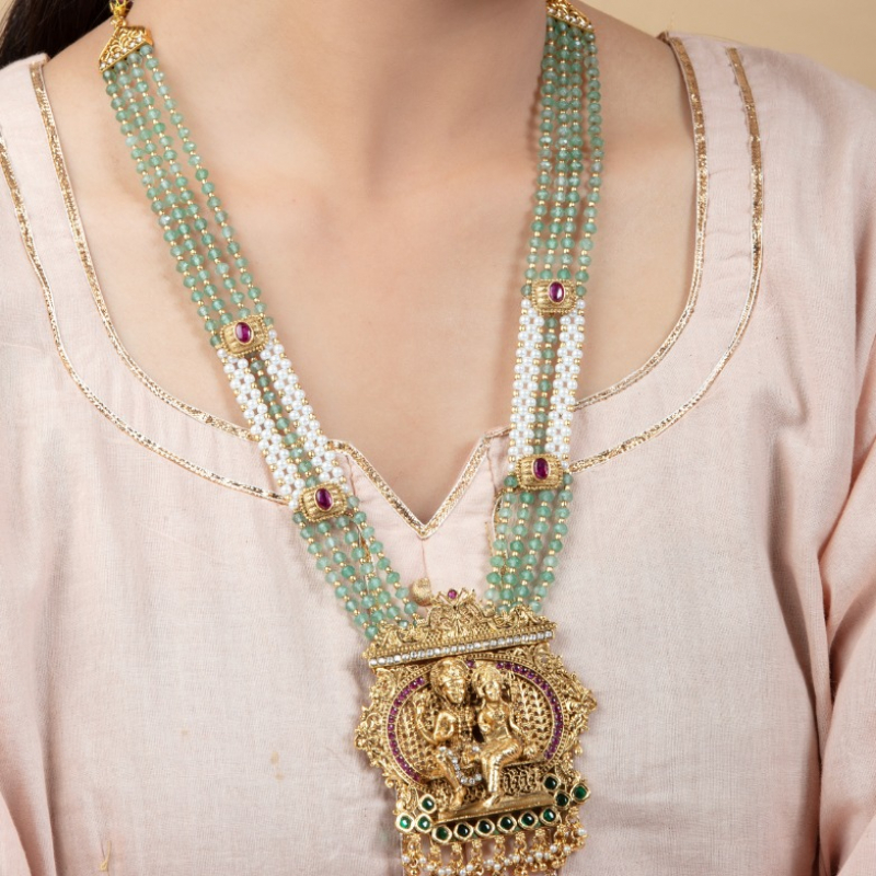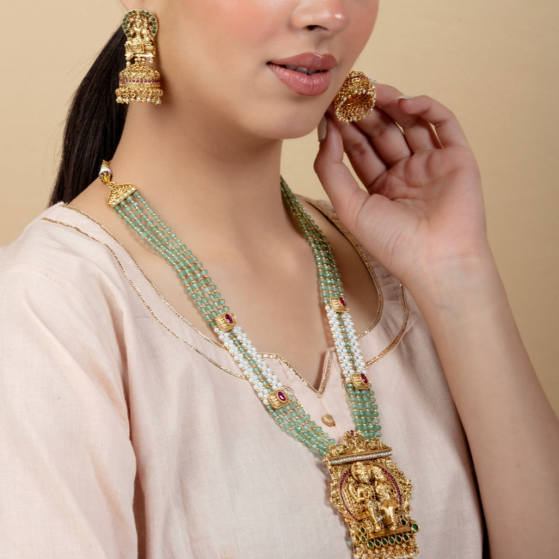 Add a touch of royal grace to your ethnic collection with this beautifully crafted long temple necklace set. Designed with multiple strands of soothing emerald-green beads, this piece is accentuated with delicate pearl sections and ruby-toned stone highlights that enhance its richness.