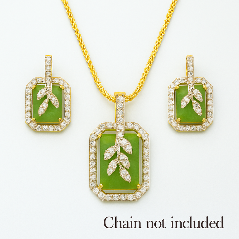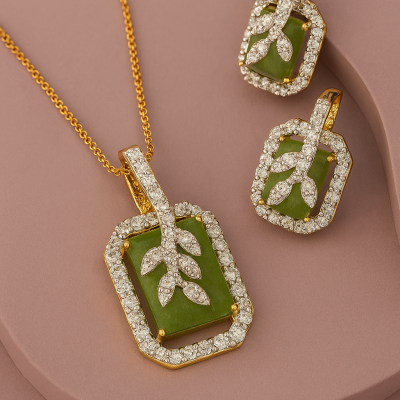 The Emerald Leaf Sparkle Pendant Set is a perfect blend of elegance and sophistication. Featuring a rectangular emerald green stone framed with dazzling American Diamond (CZ) accents, the design is enhanced with a delicate leafy motif that symbolizes grace and nature. Finished with gold polish, this pendant set includes a matching pair of earrings, making it ideal for festive occasions and stylish gatherings.