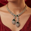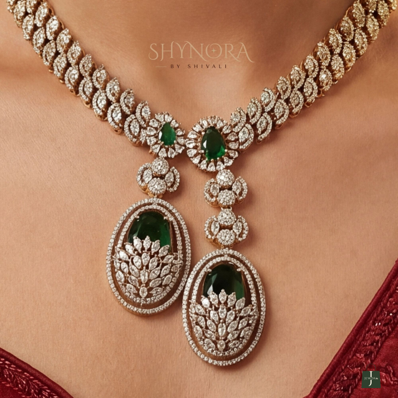 This necklace features a beautifully textured crystal leaf chain that gracefully meets twin oval emerald-green drop pendants, detailed with intricate crystal clusters for added brilliance. The matching drop earrings echo the same elegant design, creating a perfectly balanced and regal look. Finished in a rich gold tone, this set is ideal for women who love understated glamour with a statement touch.